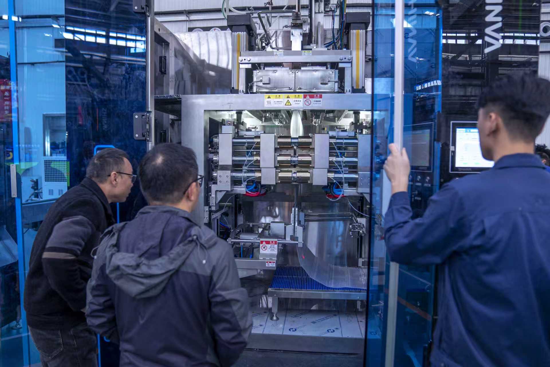 “这是四川一家制药公司定制的高速连续式‘BFS’,它的生产效率可以达到每小时灌装20000支塑料安瓿瓶。”黄利军介绍。