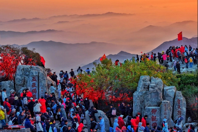 鲁中地区的重阳,是山会上的烟火气。济南千佛山山会是山东重阳最热闹的民俗盛会,自元代起,流传至今,2009 年更是被列入省级非物质文化遗产名录。每逢重阳,千佛山的石阶上便挤满了赶会的人:老人拄着拐杖,手里攥着刚买的茱萸香囊;年轻人扛着糖葫芦,牵着孩子的手往上走;路边的摊位上,糖画、面人、鲁绣等手工艺品引人驻足,油旋、甜沫、把子肉的香气勾着人的食欲。山会上最具仪式感的,莫过于“插茱萸” 和 “赏菊”。主办方会免费发放茱萸枝,游人将其插在衣襟上,循着古人的习俗祈福;而山顶的菊园里,千余盆菊花绽放,黄的似金、白的似雪、紫的似霞,将秋日点缀得格外艳丽。除了千佛山,泰安人重阳爱登泰山,曲阜人会去尼山登高,登高时还会带上自家做的可口点心,在山顶与亲友分享,风吹过山间,满是欢声笑语。