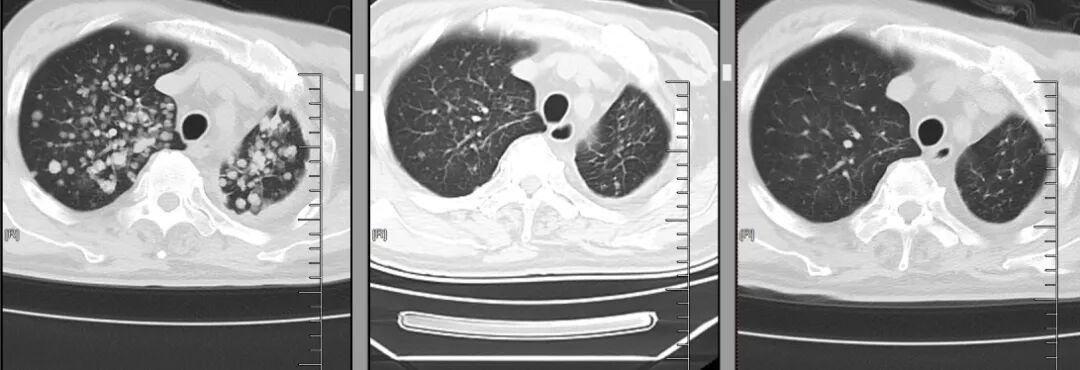 在第二周期治疗前的复查中,当肿瘤科将最新的胸部CT和头颅MRI图像调出来时,结果让人振奋:双肺原本密密麻麻的粟粒样转移结节,大多缩小至模糊不清,肺部原发灶也小了很多;双侧胸膜增厚明显变薄,原本被肿瘤侵犯的纵隔淋巴结也显著缩小;最令人惊喜的是头颅MRI,之前的十余处脑转移灶消失,近乎达到了肿瘤治疗中极具含金量的完全缓解(CR)标准!