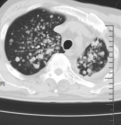 庄兴俊主任给患者安排了胸部CT,检查结果很快传来:原发性肺癌伴双肺弥漫多发转移瘤,双肺胸膜弥漫增厚,纵隔淋巴结也已被肿瘤侵犯,肺部成了肿瘤蔓延重灾区。