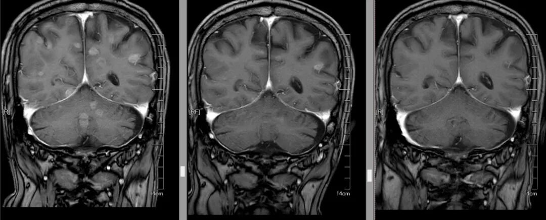 为进一步排查其他部位转移,庄主任随即安排了头颅MRI检查,患者颅内密密麻麻分布着十余处转移灶,最大的直径达3cm,最小的仅5mm,如同隐藏在脑部的定时炸弹。