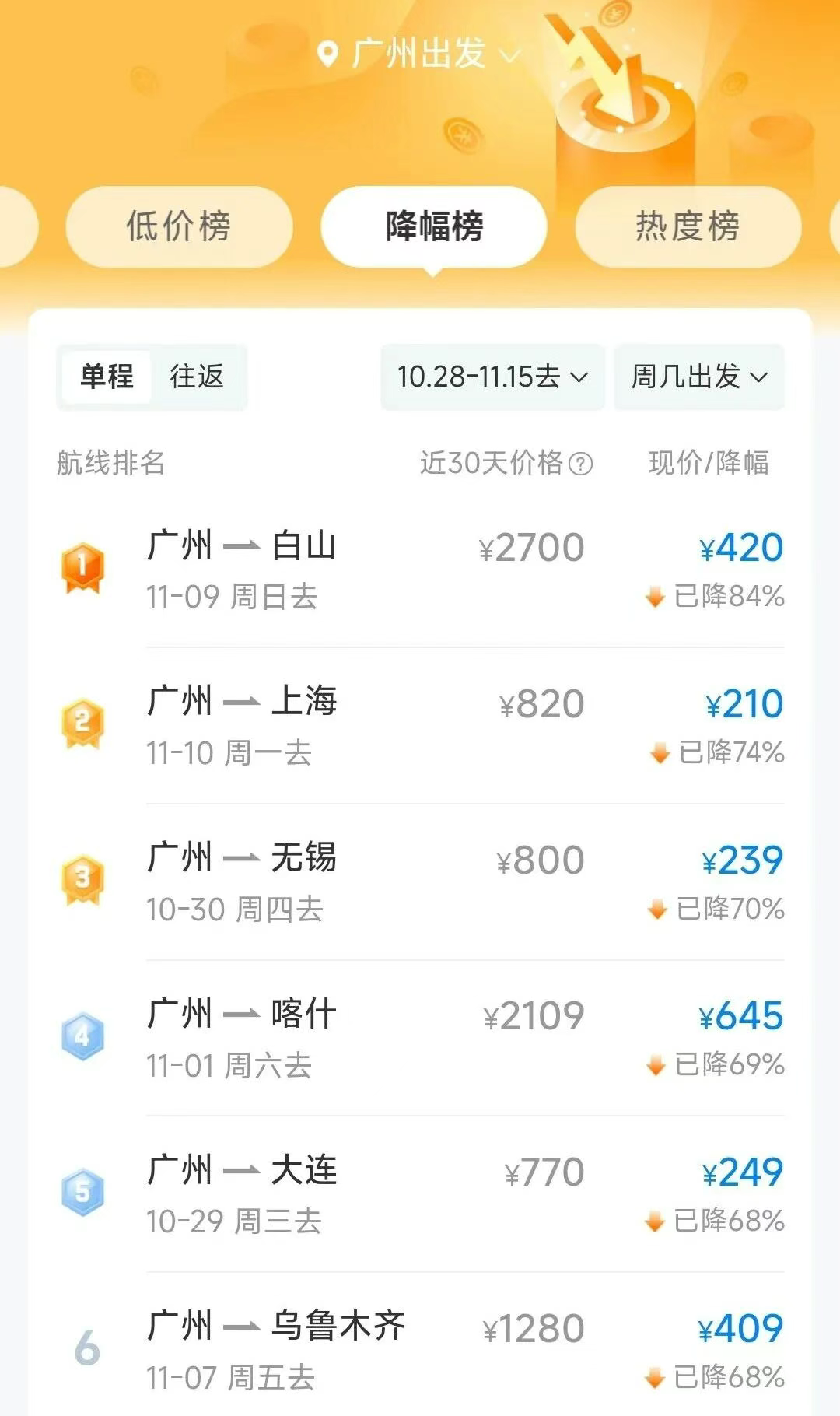 第三方售票平台显示,十月下旬至十一月广州出发前往上海、无锡、大连、武汉、南京等地的机票价格大幅下降,最高降幅达84%。