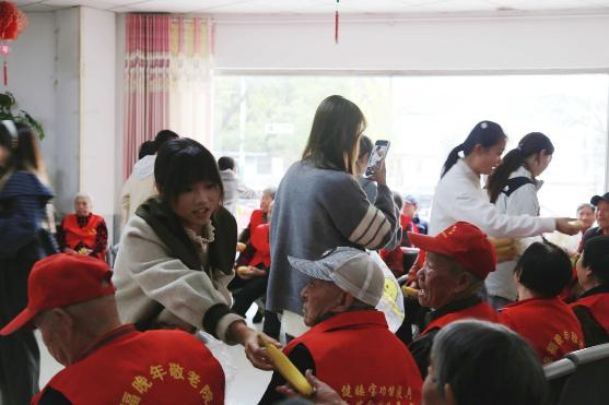 高校学子也积极加入敬老队伍,为节日增添青春活力。北京交通大学威海校区以“情暖夕阳红 青春伴我行”为主题,组织青年学子前往敬老院开展志愿服务。青年学子们为老人分发慰问品,开展文艺表演,悠扬的歌曲、明快的乐器独奏、活力的舞蹈、幽默的小品、深情的诗歌朗诵轮番登场。老人们坐在台下,或静静聆听,或跟着节奏轻拍手,当熟悉的经典老歌响起时,不少老人还跟着哼唱,温馨的旋律将现场氛围推向高潮。