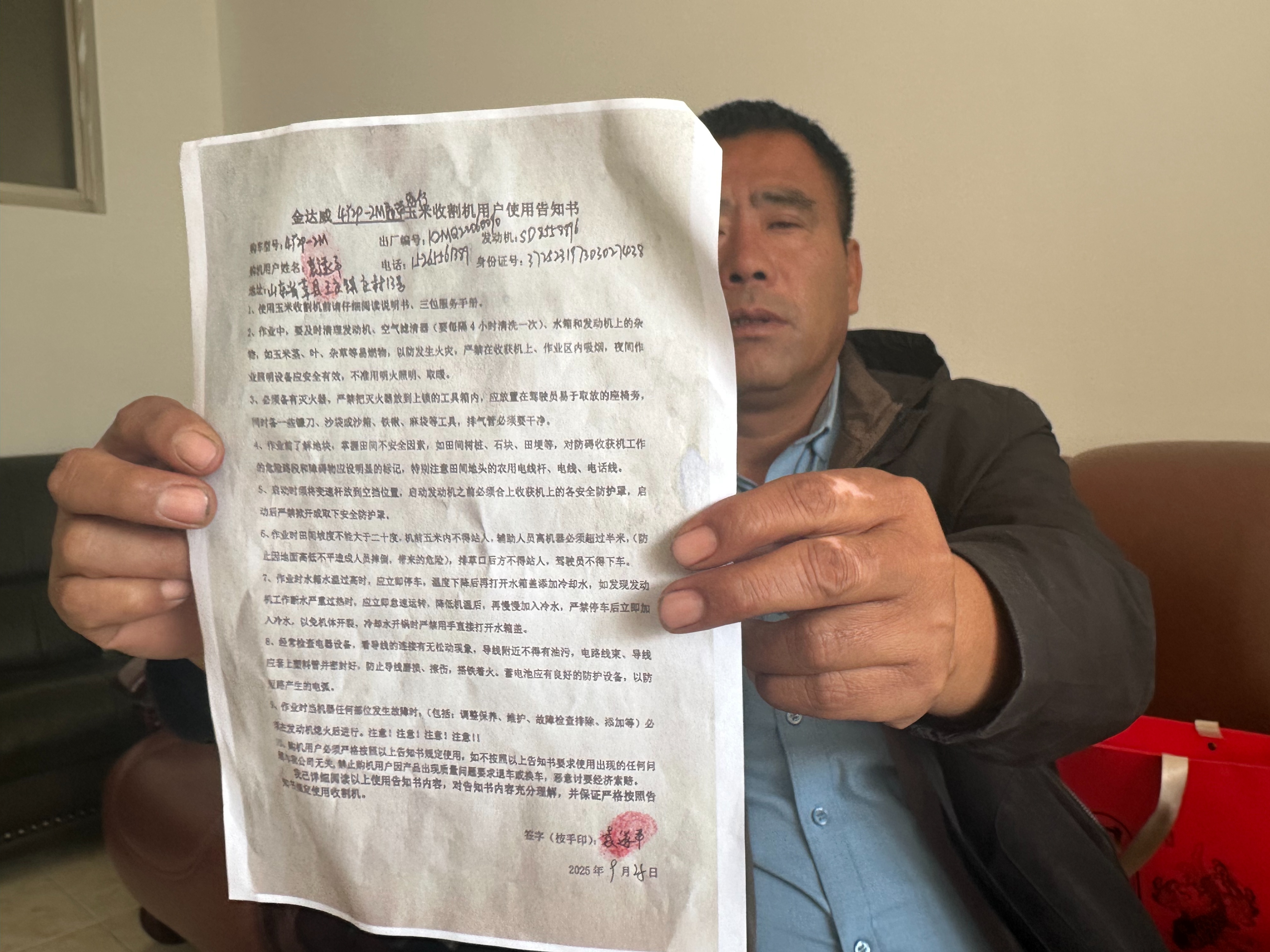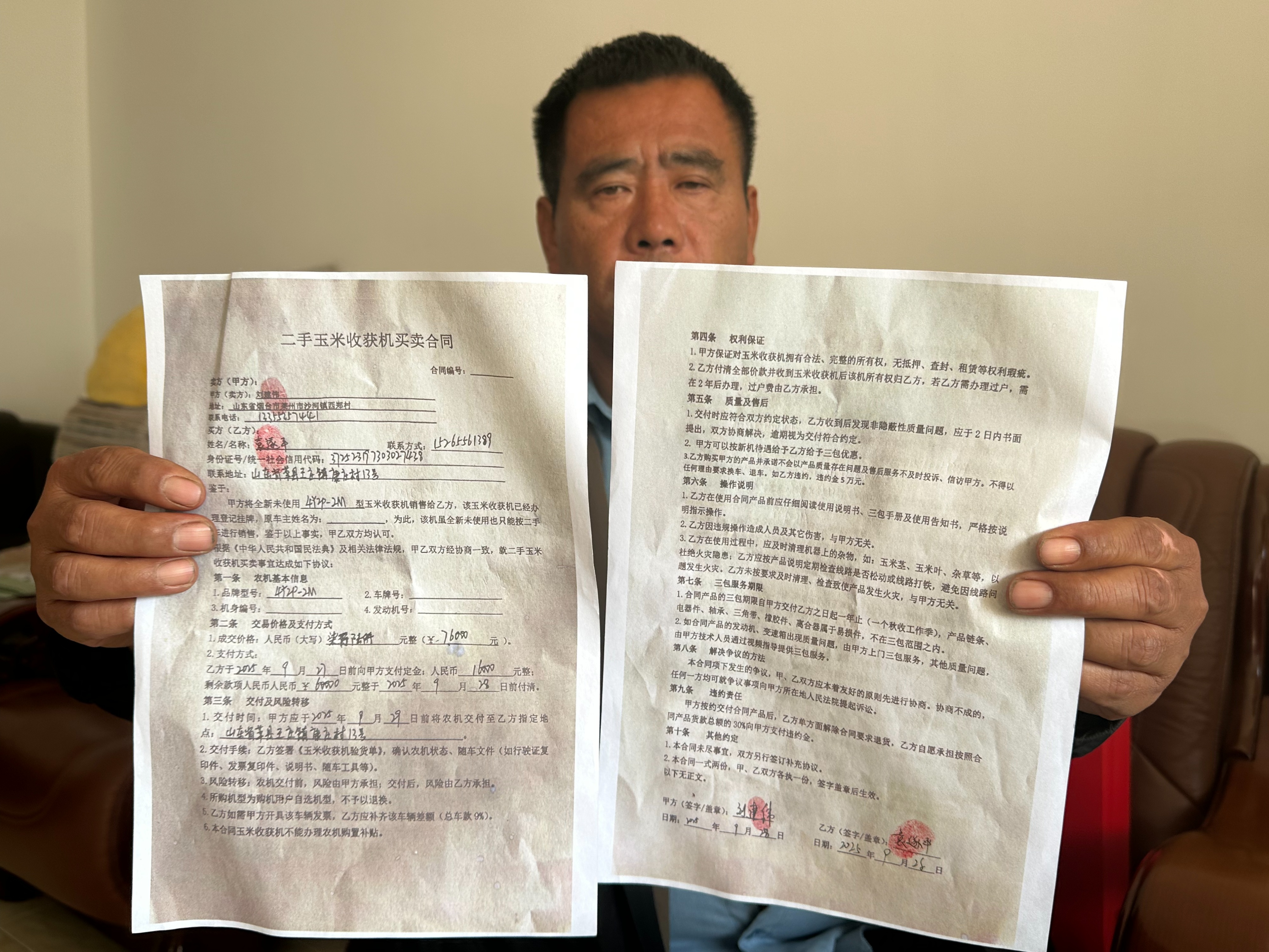 袁先生告诉记者,他是莘县王庄镇一家家庭农场的负责人,今年种了200亩玉米。眼看着玉米快成熟,加之天气预报显示未来国庆节期间有连续阴雨天气。于是,9月28日,他紧急联系从烟台市莱州农业科技有限公司购买了一台克拉斯(山东)农业机械有限公司生产的4Y2P-2M履带式玉米收获机,并通过网上转账支付76000元,9月29日,经销商就将这台农机用大货车连夜托运到了农场。袁先生坦言:当初购买时,经销商表示这是一台库存新车,因此价格上会有优惠。根据他提供的购买合同,记者注意到,合同种也注明“该机虽全新未使用也只能按二手车销售”。不过,袁先生觉得反正都是新机器,库存一两年也应该没问题。