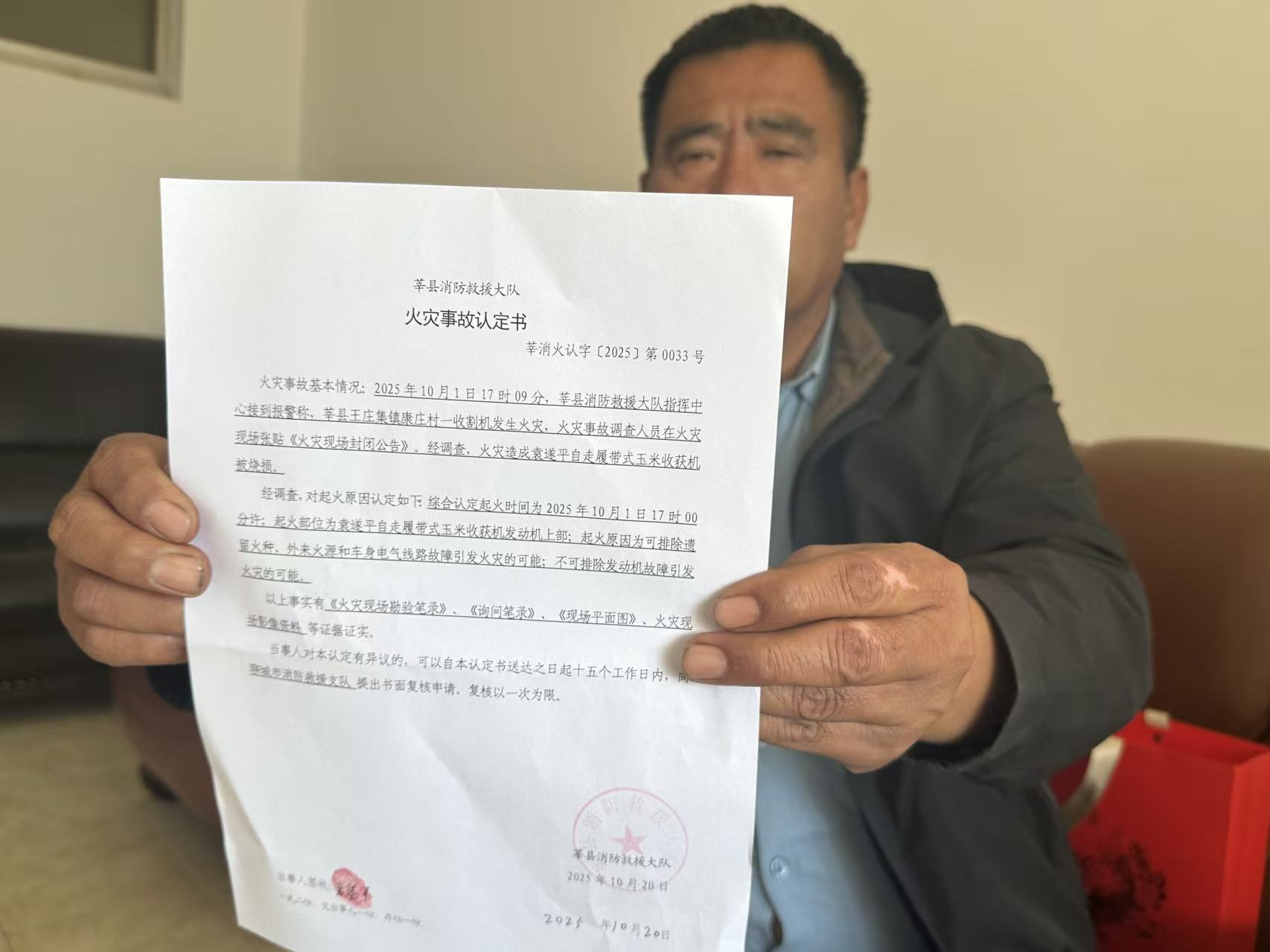 10月20日,莘县消防救援大队也出具了一份火灾事故认定书,对起火原因认定如下:起火部位为自走履带式玉米收获机发动机上部;起火原因为可排除遗留火种、外来火源和车身电气线路故障引发火灾的可能,不可排除发动机故障引发火灾的可能。记者根据袁先生提供的网址,发现该品牌收获机也发生过类似自燃事故。