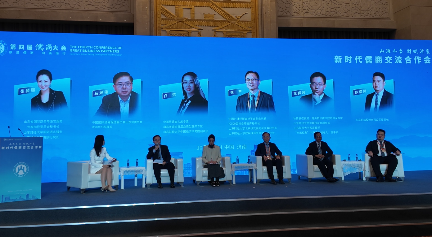 随后,在山财教授的主持下,一场围绕“新时代儒商如何助力山东区域协调发展与产业升级”主题的圆桌对话现场开启,来自政府部门、学会、金融公司、临沂当地企业的5位嘉宾进行了交流。