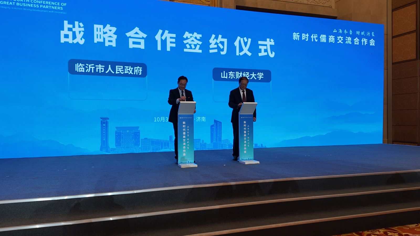 10月30日上午,第四届儒商大会在济南开幕。当天下午,山东财经大学与临沂市人民政府共同开启了本届大会的一场重要分论坛——“山海齐鲁 财赋沂蒙”新时代儒商交流合作会。会上,山东财经大学与临沂市人民政府共同签署战略合作协议,并揭牌了临沂商城国际化产教融合实践中心。