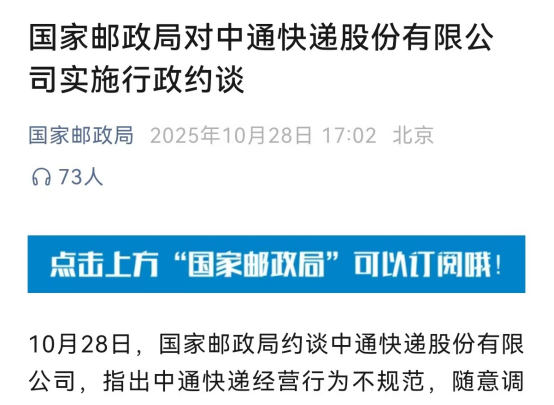 在这样的背景下,10月28日,国家邮政局对中通快递进行约谈,点出了服务质量、运营规则和快递员保障等问题。这并不是单点敲打,而是对全国快递行业的一次郑重提醒。