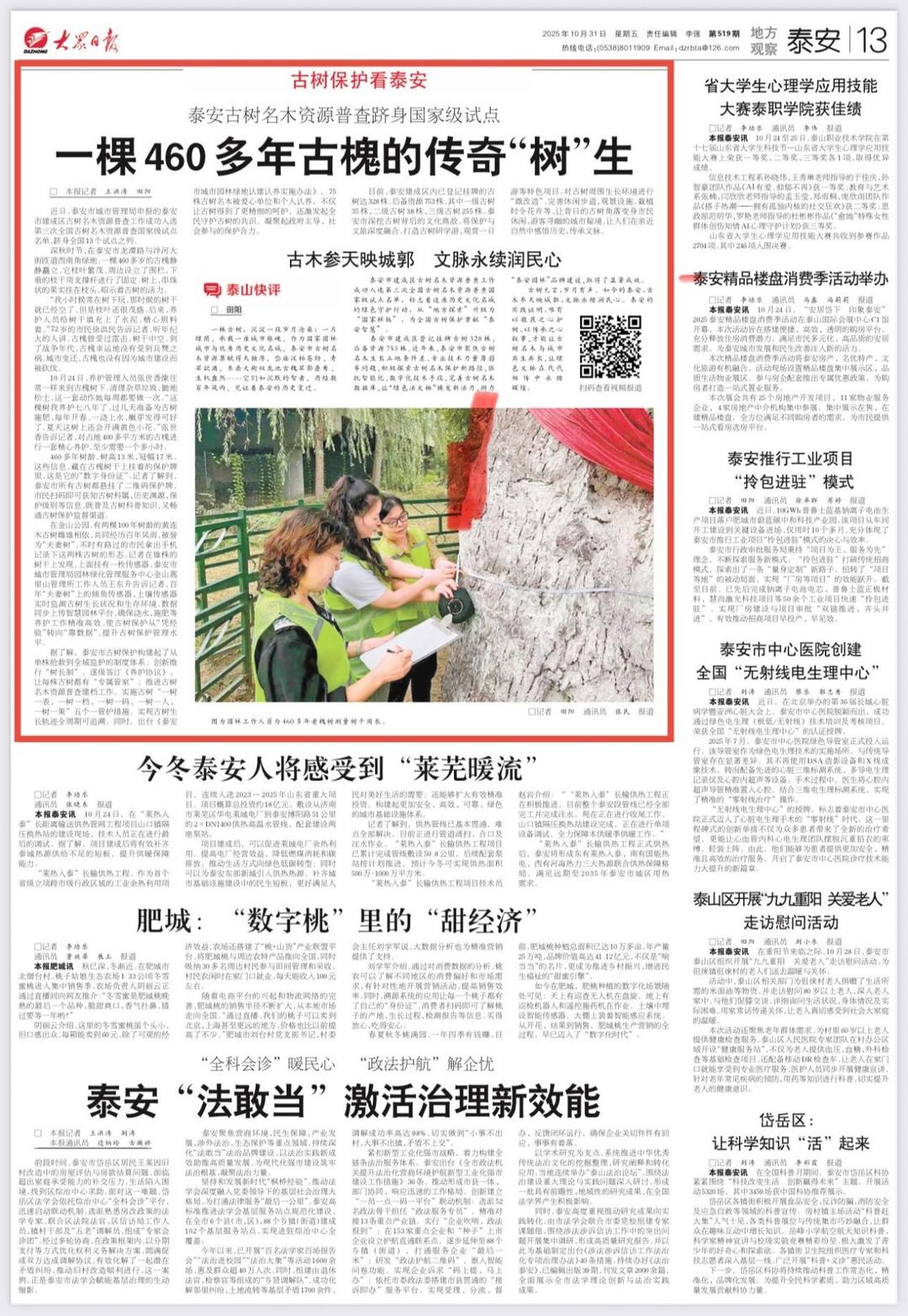 10月31日,大众日报泰安新闻推出重磅策划“古树保护看泰安”刊发《一棵460多年古槐的传奇“树”生》,报道泰安古树名木资源普查跻身国家级试点,古树保护构建起从单株抢救到全域监护的制度体系;创新推行“树长制”,逐级签订《养护协议》,让每株古树都有“专属管家”。详情请点击这里——