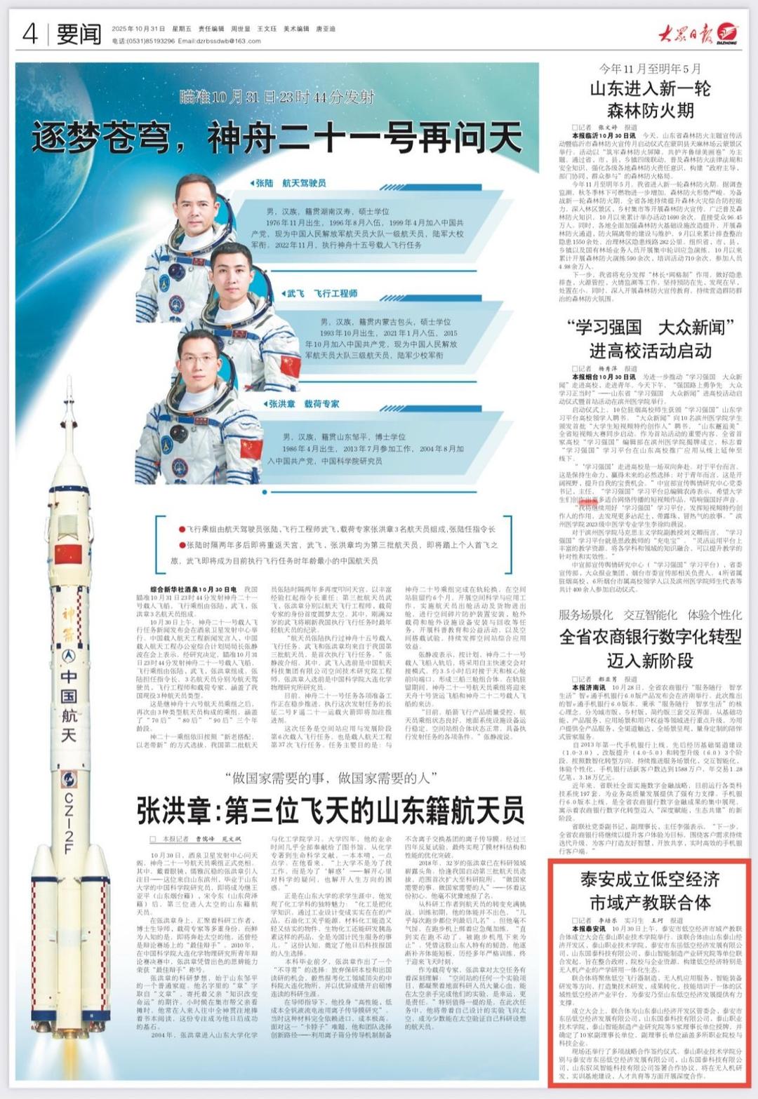 10月31日,4版要闻刊发《泰安成立低空经济市域产教联合体》,报道泰安市低空经济市域产教联合体成立大会在泰山职业技术学院举行。详情请点击这里——