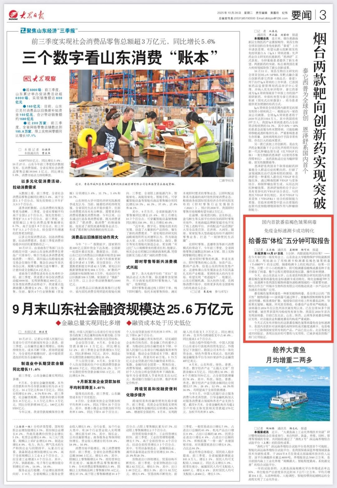 10月28日,3版要闻刊发《给番茄“体检”五分钟可取报告》,报道由山东农业大学、山东省农科院联合研发的国内首款番茄褐色皱果病毒免疫金标速测卡成功转化。详情请点击这里——