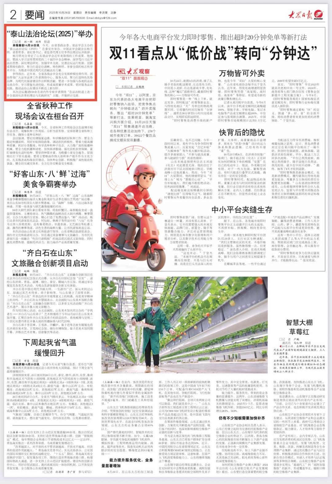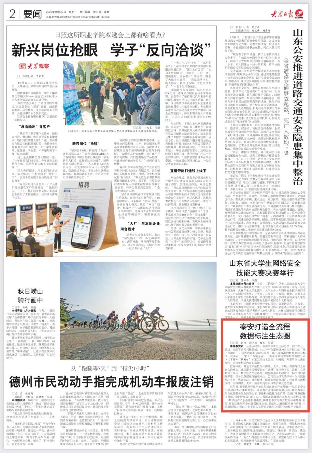 10月27日,2版要闻刊发《泰安打造全流程数据标注生态圈》,报道泰安集聚30余家数据标注企业,形成从上游数据采集与治理,中游数据标注与加工,到下游人工智能训练与应用的全流程产业链条。详情请点击这里——