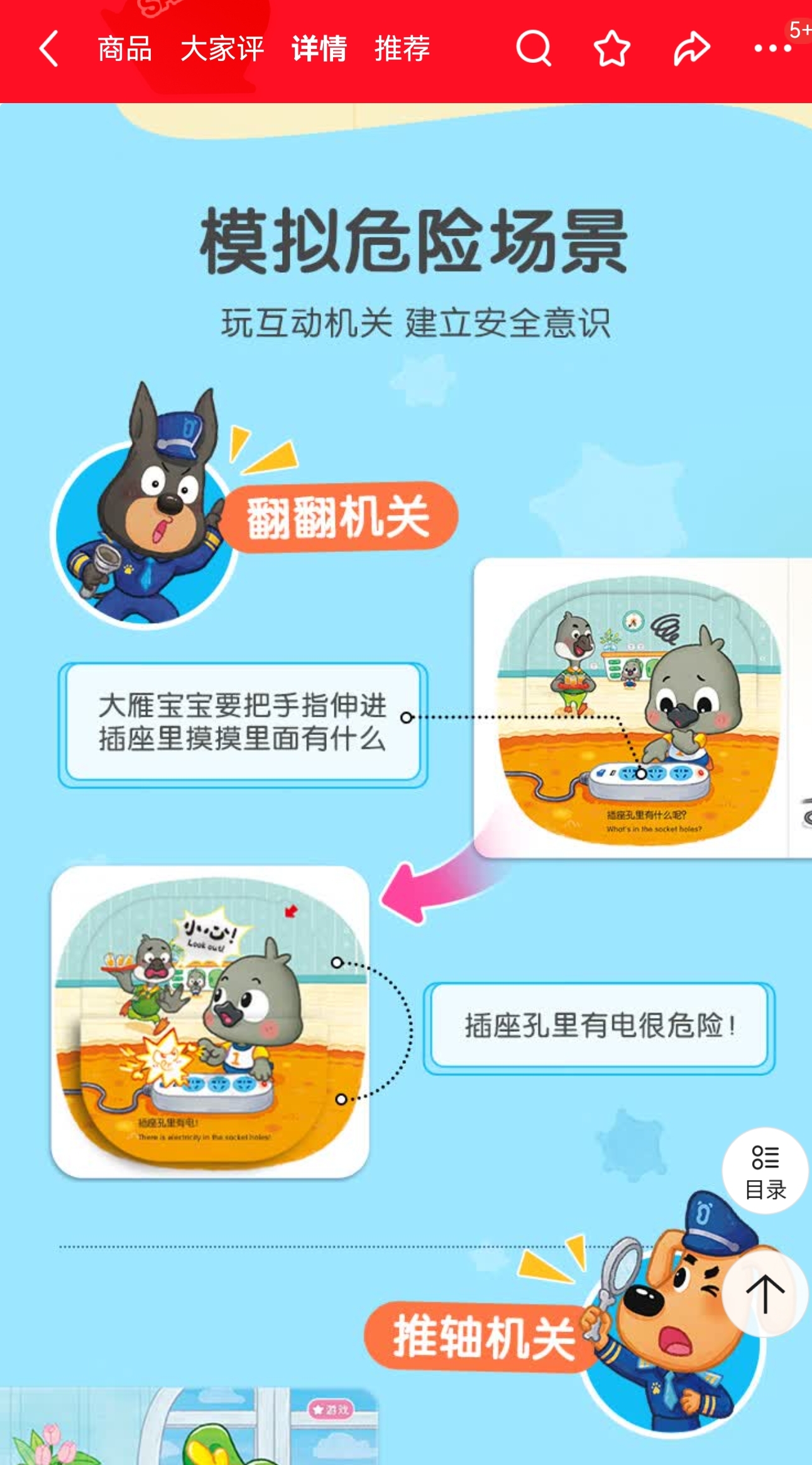 随后,记者在某电商平台搜索“宝宝巴士图书旗舰店”发现,涉事绘本全称为“宝宝巴士安全绘本—居家安全篇”,包含《啊!小心烫伤》《啊!小心触电》《啊!小心吃东西》《啊!小心玩耍》4册,该绘本支持点读互动功能,用户可通过点读笔点击绘本中的识别码,便可触发对应的音效。官方售价58元,声称面向的是2-3岁儿童。在产品介绍的“模拟危险场景”中,还显著标注着两句话,分别是“大雁宝宝要把手指伸进插座里摸摸里面有什么”“插座孔里有电很危险!”的描述。