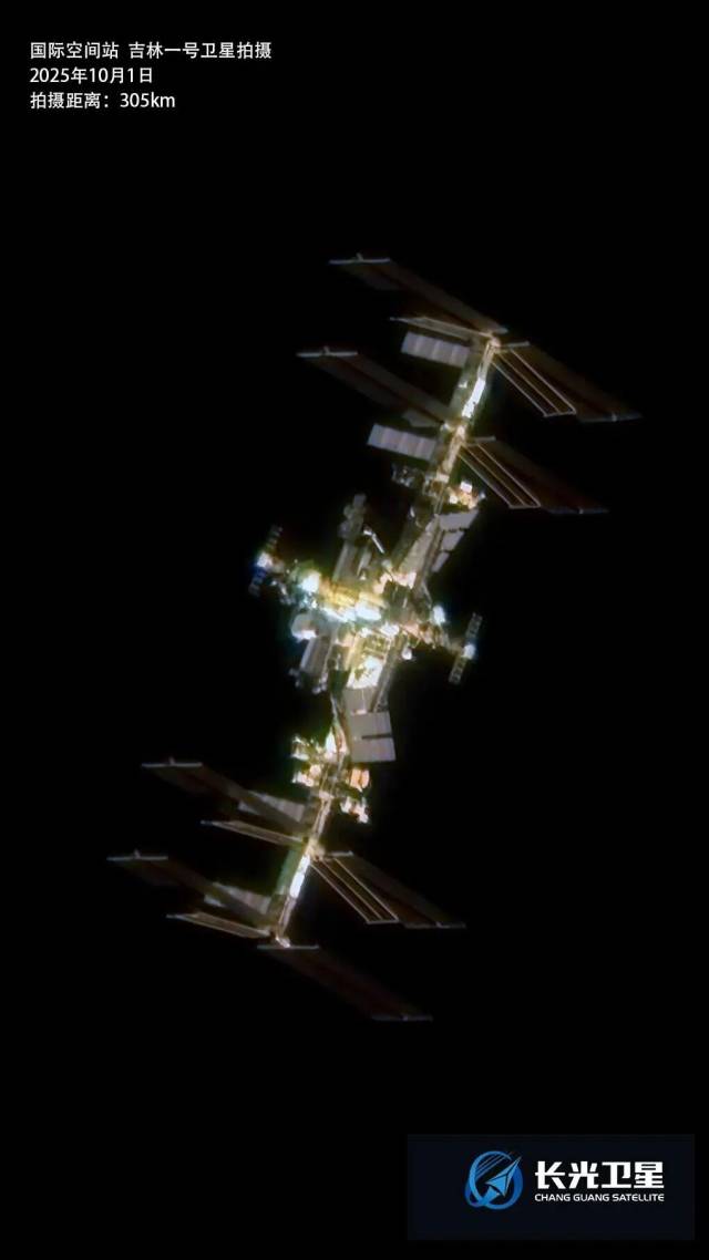 10月1日,“吉林一号”卫星距离305公里,拍摄到了一组国际空间站的高清卫星影像:国际空间站宛如一座庞大的太空城堡,在深邃的宇宙背景中显得格外醒目。