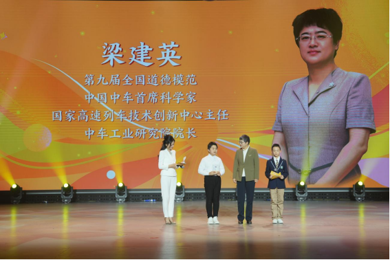 “新时代好少年”陶浩宇在活动现场遇见了自己的偶像,第九届全国道德模范、中车工业研究院梁建英院长。梁院长寄语热爱科创的孩子们,科研路上没有一蹴而就,青少年成长在科技腾飞的时代,肩负着突破核心技术、建设科技强国的使命,希望孩子们融入国家发展,敢想敢试、敢闯敢拼,在属于自己的时代里,跑出中国速度。