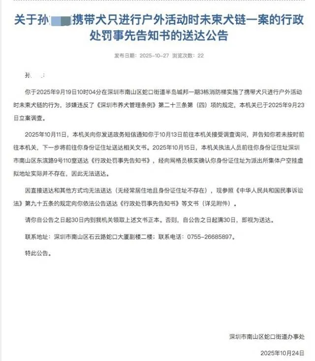 近日,深圳市南山区蛇口街道办事处就一起养犬管理案件出具行政处罚事先告知书,当事人因携带犬只进行户外活动时未束犬链被处以罚款。