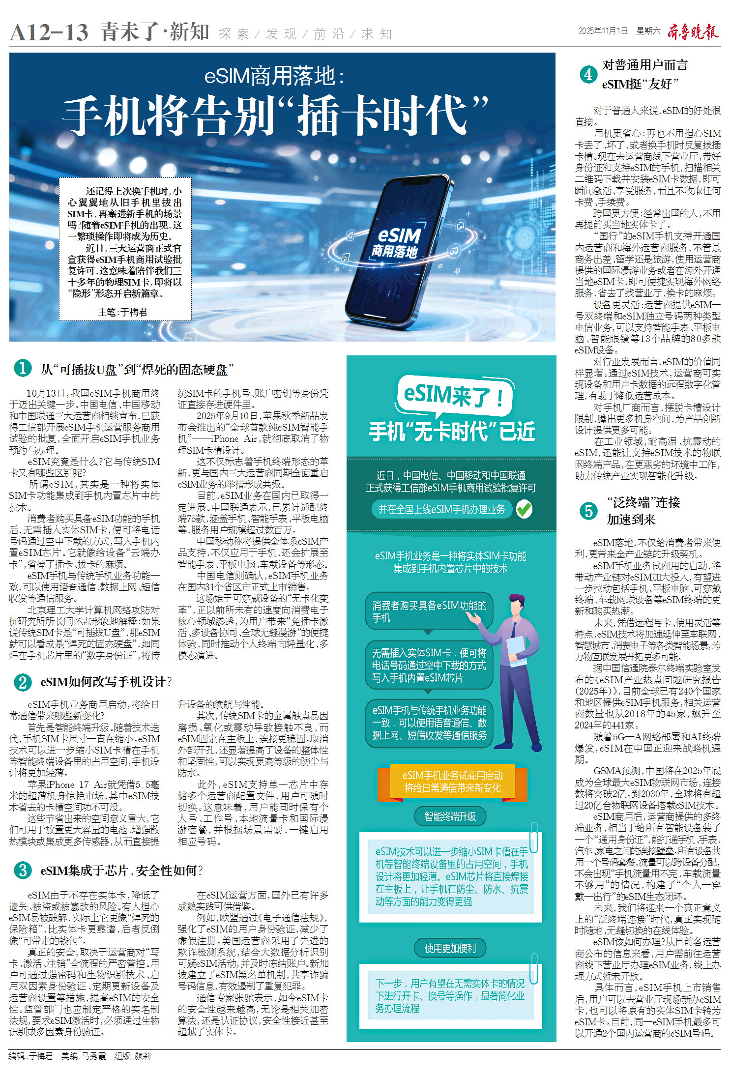 我们熟知的实体手机卡叫SIM卡,而eSIM即嵌入式SIM卡,是一种新型的SIM卡形式。它直接集成在手机芯片上,无需再插入实体SIM卡。北京理工大学计算机网络攻防对抗研究所所长闫怀志形象地解释:“如果说传统SIM卡是‘可插拔U盘’,那eSIM就可以看成是‘焊死的固态硬盘’。”eSIM如同焊在手机芯片里的“数字身份证”,将传统SIM卡的手机号、账户密钥等身份凭证直接存进硬件里。