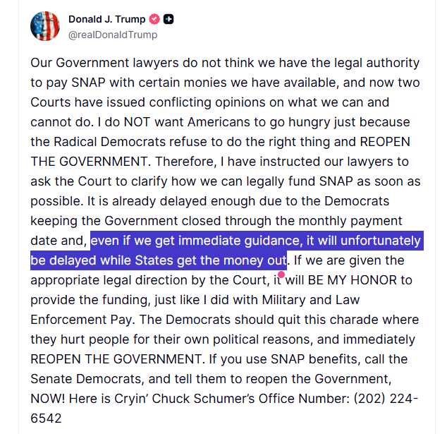 按照特朗普的最新表态,“即便得到了明确的法律指引,各州的资金发放仍然会被推迟”。有美国媒体分析认为,尽管法官作出了恢复“补充营养援助计划”的裁决,但资金从拨付到具体落地,仍然需要经历一系列法律与行政流程,因此4200万美国人的基本食物供应难题可能会从11月开始持续一段时间。