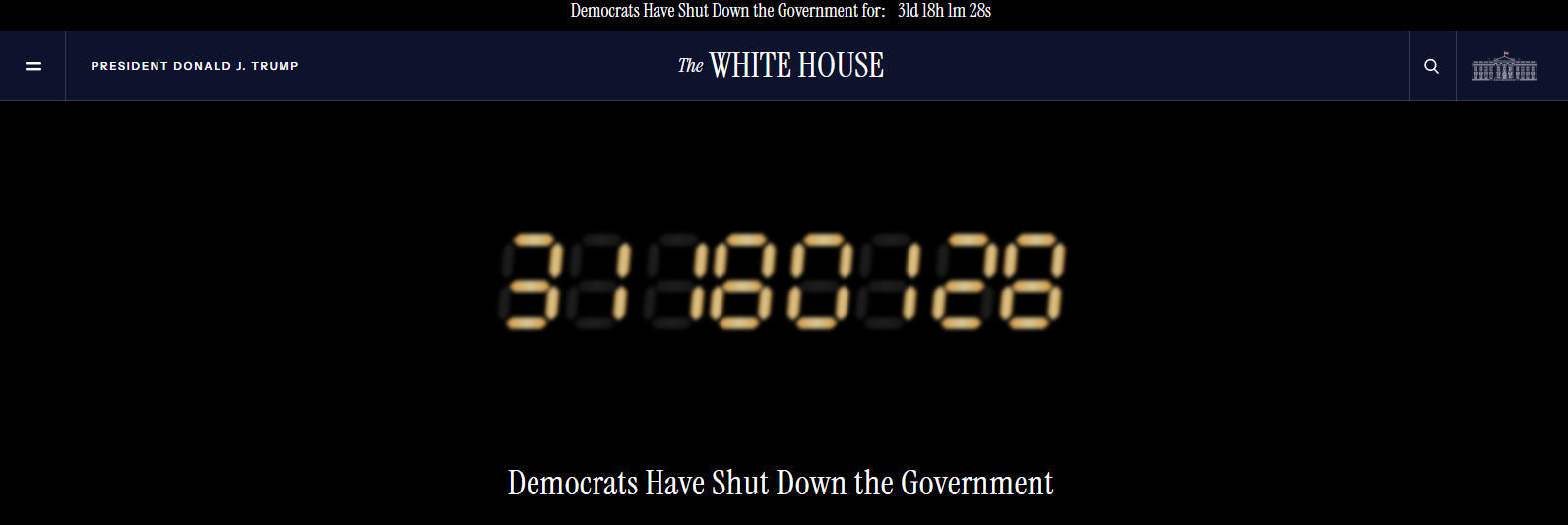 截至美东时间11月1日18时(北京时间11月2日6时),美国白宫官网实时刷新纪录的这次美国政府“停摆”已经持续了31天零18个小时。在白宫官网的页面上,写有“民主党人关停了政府”的字样。
