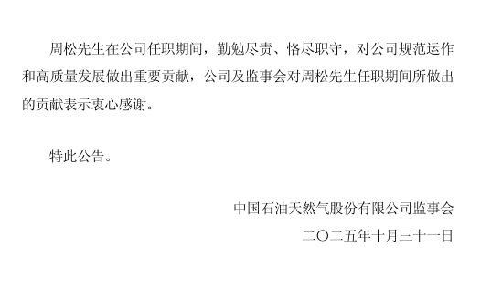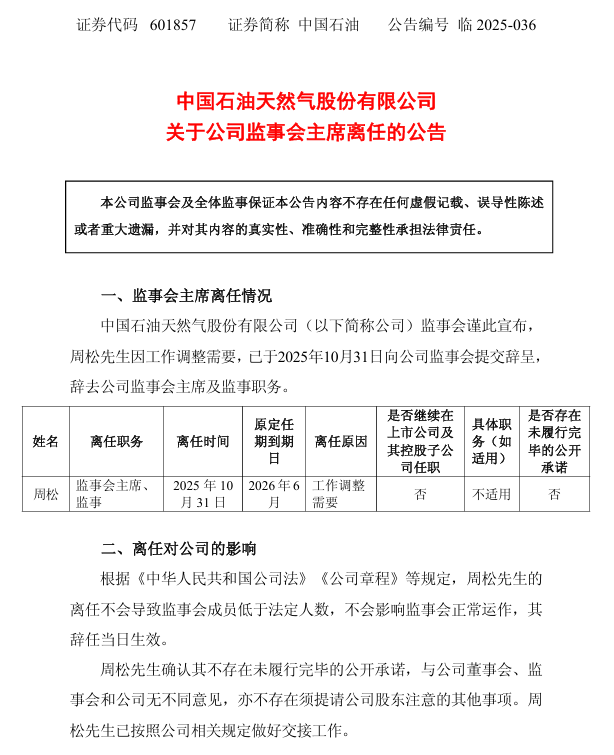 中国石油发布公告称,公司监事会宣布,周松先生因工作调整需要,已于2025年10月31日向公司监事会提交辞呈,辞去公司监事会主席及监事职务。