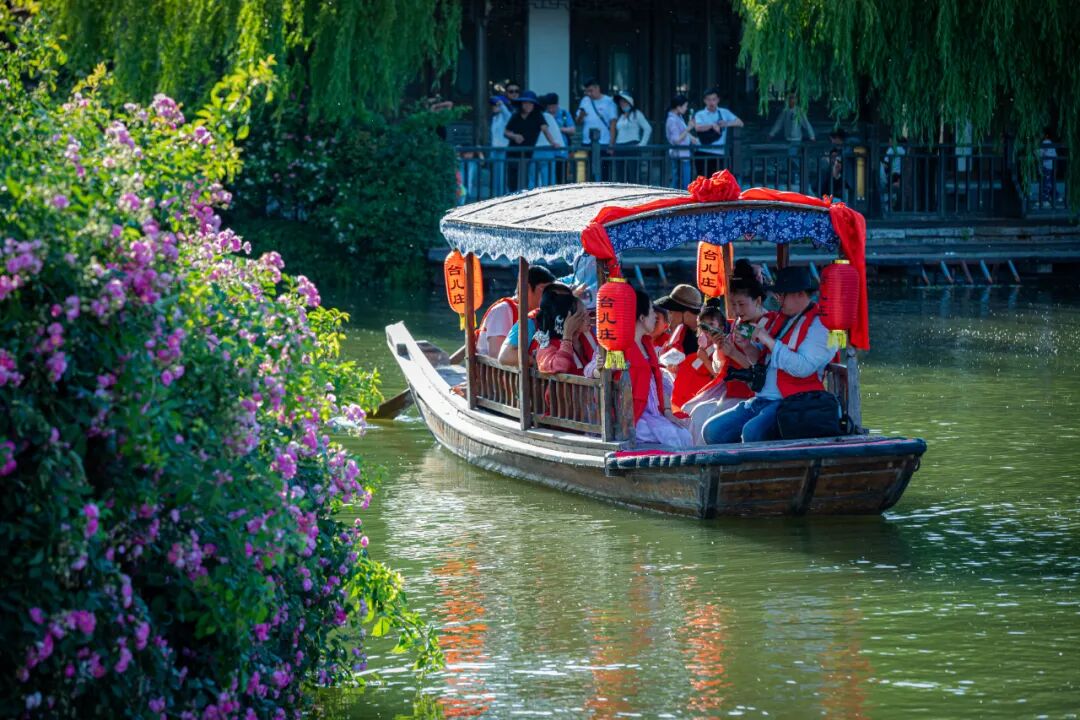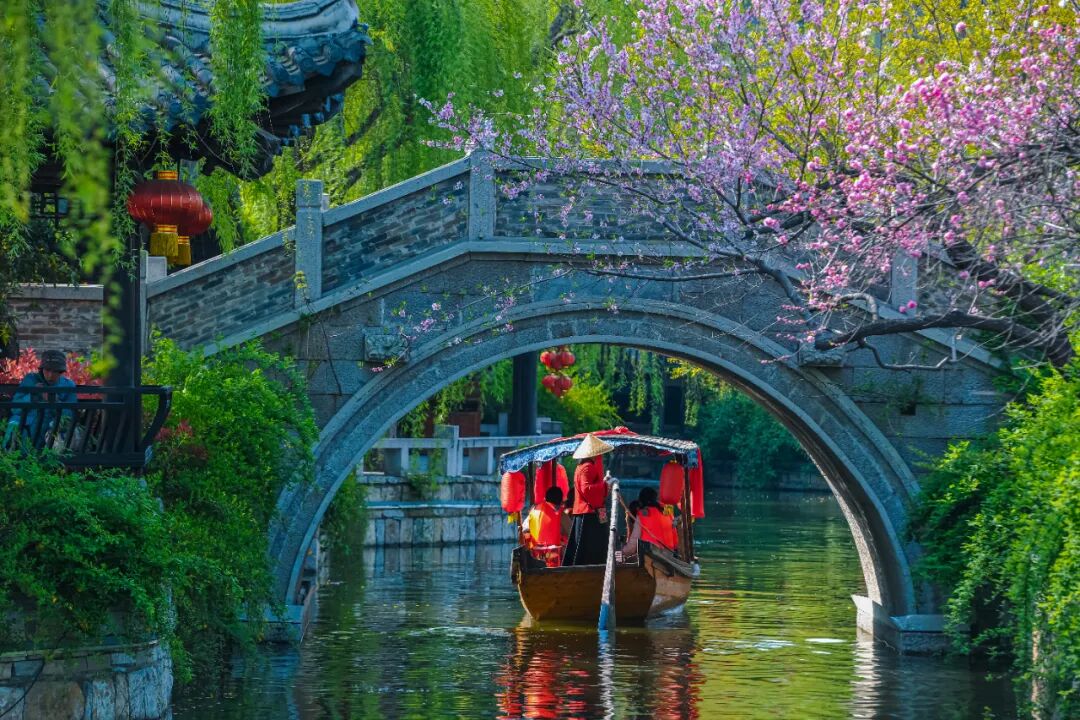 “舟行碧波上,人在画中游”的诗意,在此刻化为现实。乘一叶摇橹船,任春风吹面,听船歌袅袅,看两岸的花影与古建倒映在碧波之中。