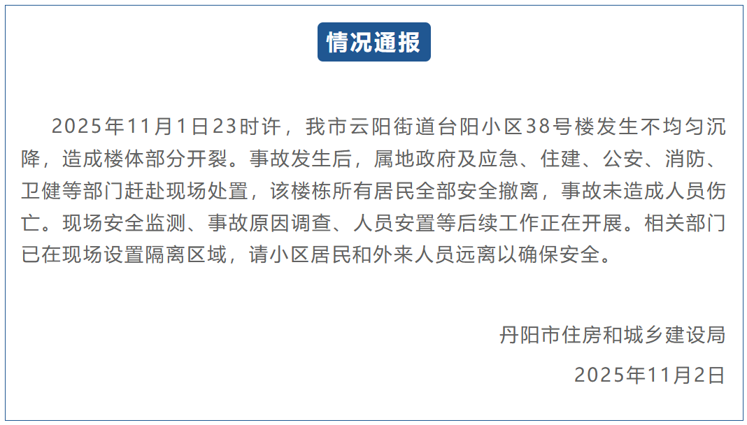 11月2日,江苏镇江丹阳市住房和城乡建设局通报,11月1日23时许,丹阳市云阳街道台阳小区38号楼发生不均匀沉降,造成楼体部分开裂。事故发生后,属地政府及应急、住建、公安、消防、卫健等部门赶赴现场处置,该楼栋所有居民全部安全撤离,事故未造成人员伤亡。现场安全监测、事故原因调查、人员安置等后续工作正在开展。相关部门已在现场设置隔离区域,请小区居民和外来人员远离以确保安全。