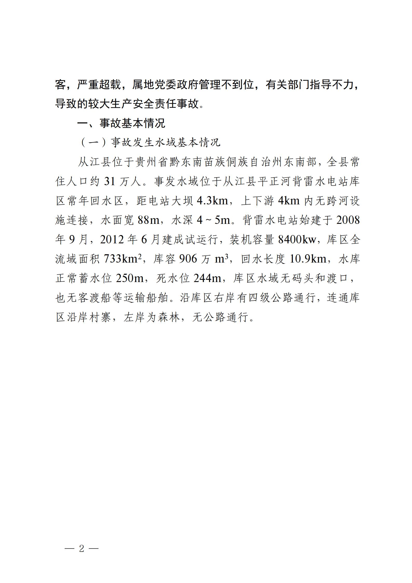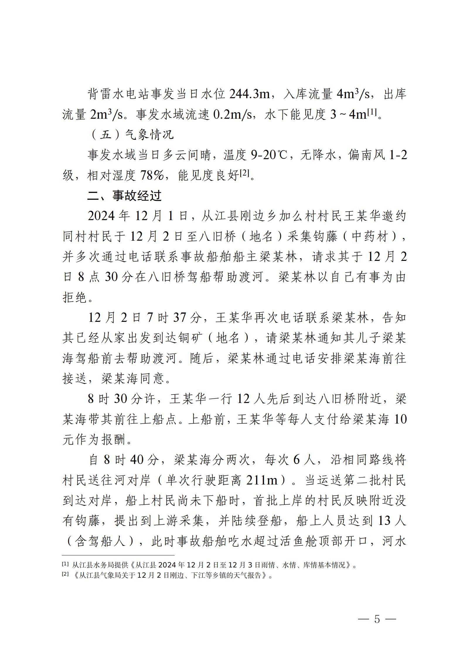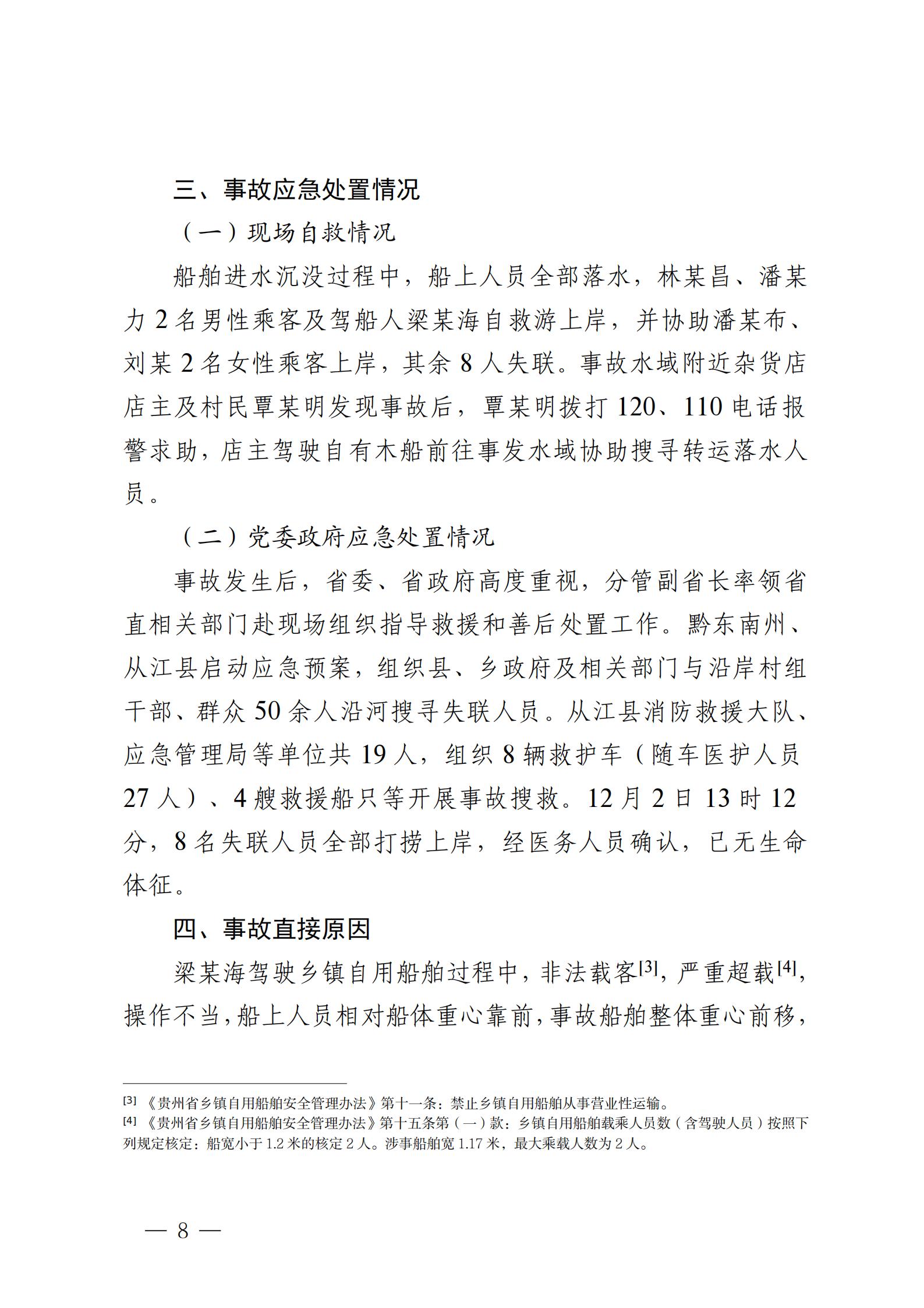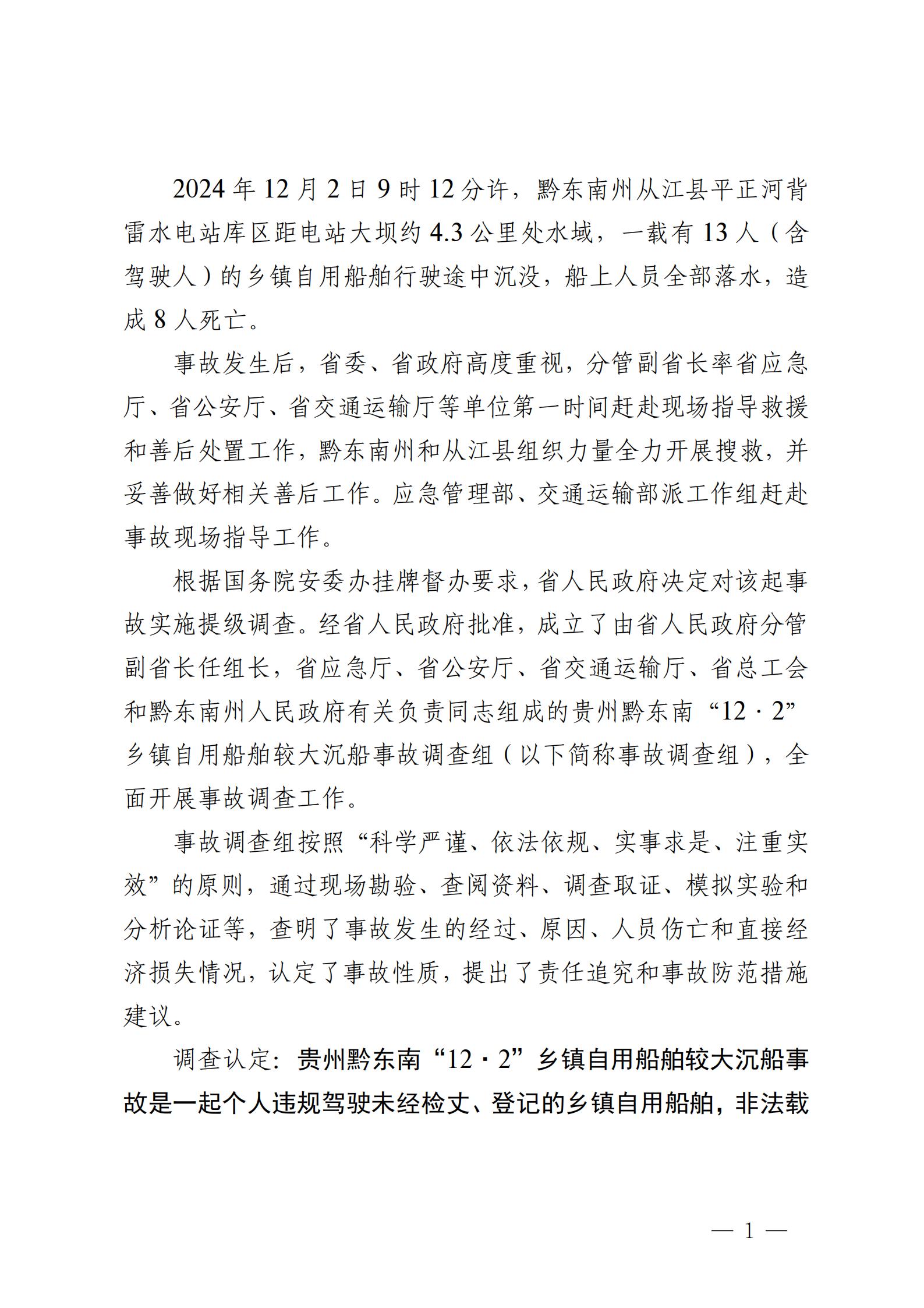 根据贵州省应急管理厅11月4日公布的调查报告,2024年12月2日9时12分许,黔东南州从江县平正河背雷水电站库区距电站大坝约4.3公里处水域,一载有13人(含驾驶人)的乡镇自用船舶行驶途中沉没,船上人员全部落水,造成8人死亡。