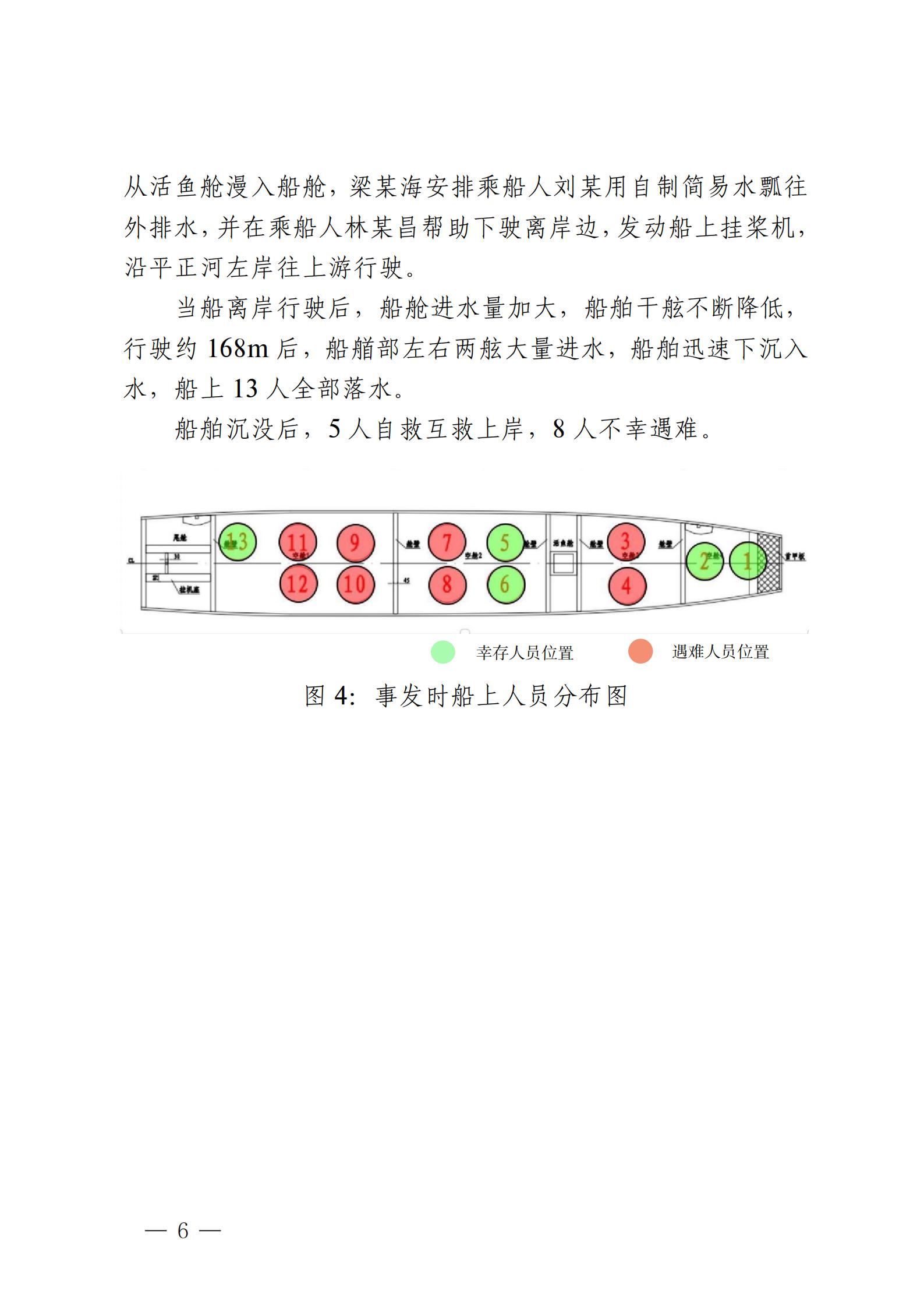 2024年12月2日8时30分许,王某华一行12人先后到达八旧桥附近,梁某海带其前往上船点。上船前,王某华等每人支付给梁某海10元作为报酬。自8时40分,梁某海分两次,每次6人,沿相同路线将村民送往河对岸(单次行驶距离211m)。当运送第二批村民到达对岸,船上村民尚未下船时,首批上岸的村民反映附近没有钩藤,提出到上游采集,并陆续登船,船上人员达到13人(含驾船人),此时事故船舶吃水超过活鱼舱顶部开口,河水从活鱼舱漫入船舱,梁某海安排乘船人刘某用自制简易水瓢往外排水,并在乘船人林某昌帮助下驶离岸边,发动船上挂桨机,沿平正河左岸往上游行驶。当船离岸行驶后,船舱进水量加大,船舶干舷不断降低,行驶约168m后,船艏部左右两舷大量进水,船舶迅速下沉入水,船上13人全部落水。船舶沉没后,5人自救互救上岸,8人不幸遇难。
