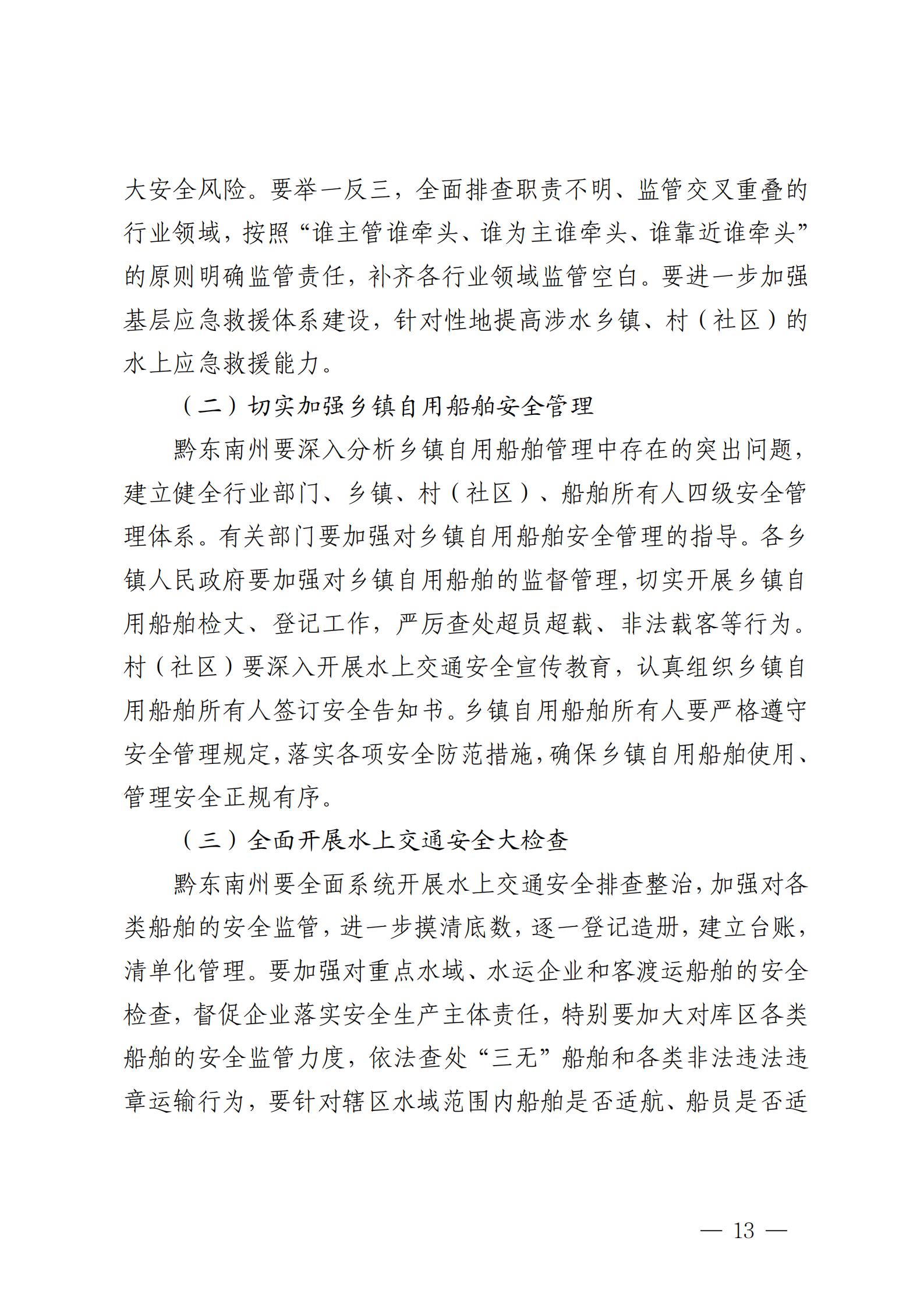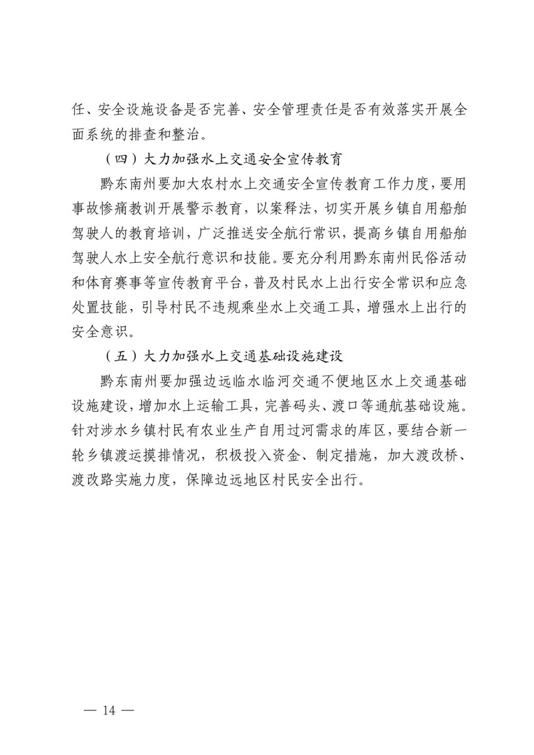 与此同时,黔东南州要加大农村水上交通安全宣传教育工作力度,要用事故惨痛教训开展警示教育,以案释法,切实开展乡镇自用船舶驾驶人的教育培训,广泛推送安全航行常识,提高乡镇自用船舶驾驶人水上安全航行意识和技能;普及村民水上出行安全常识和应急处置技能,引导村民不违规乘坐水上交通工具,增强水上出行的安全意识。
