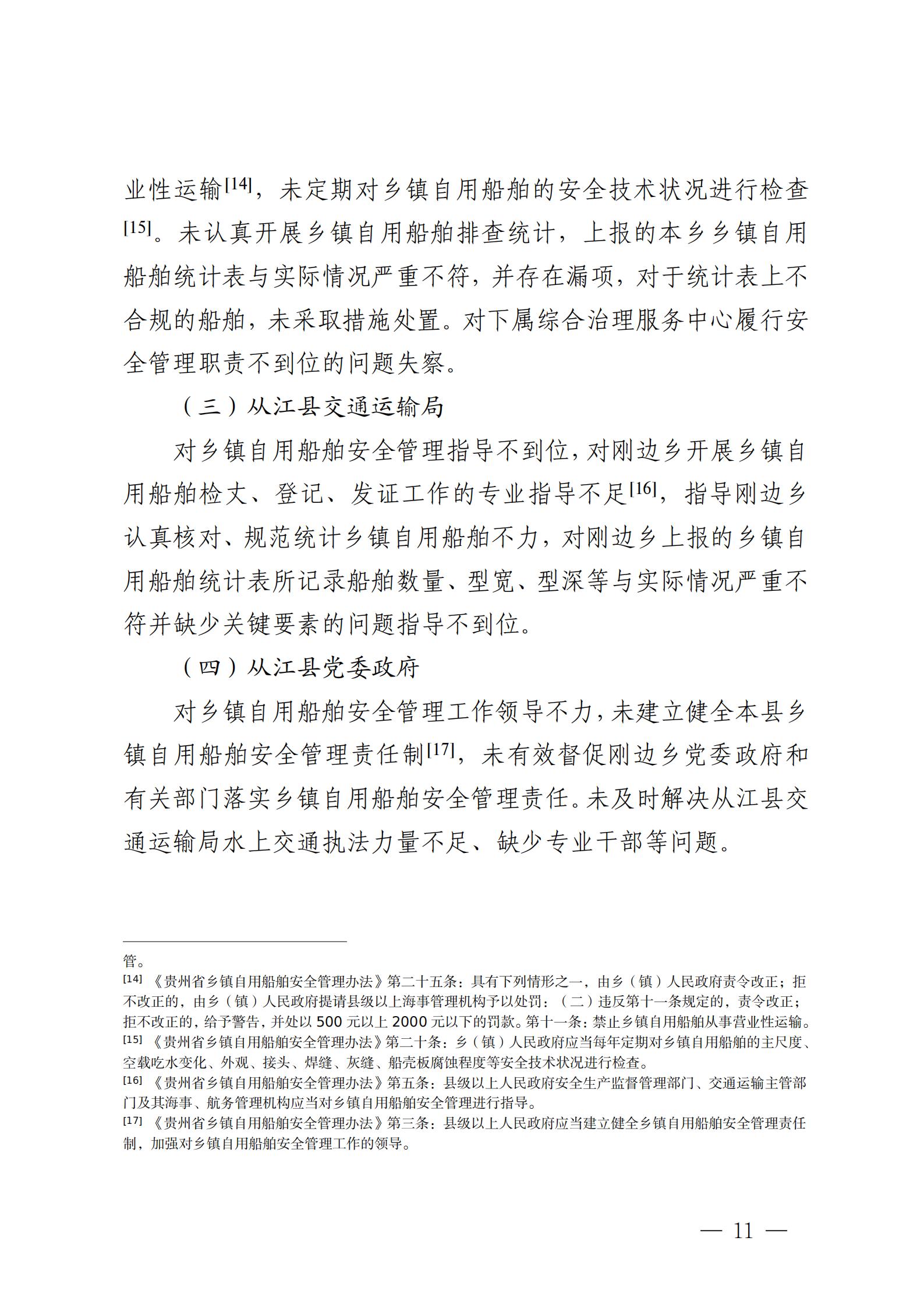 另据贵州省纪委监委网站11月4日消息,2024年12月2日,黔东南州从江县平正河背雷水电站库区距电站大坝约4.3公里处水域发生一起翻船事故,造成8人死亡,直接经济损失79.56万元。省人民政府成立事故调查组开展调查,认定此次事故是一起较大生产安全责任事故。省纪委省监委依规依纪依法开展审查调查,对从江县委、从江县人民政府、从江县交通运输局、刚边乡党委、刚边乡人民政府等5家责任单位和11名相关责任人进行追责问责。其中,党纪政务处分10人,诫勉1人、责令5家单位作出书面检查。