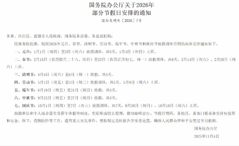 11月4日,国务院办公厅印发《关于2026年部分节假日安排的通知》,其中,2026年春节假期安排为2月15日至2月23日,共9天,为史上最长春节假期。