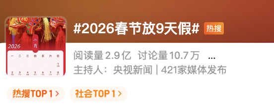 据南都N视频,记者注意到,此次放假安排有诸多亮点,2026年春节假期安排为2月15日至2月23日,共9天,是史上最长的春节假期,公众可错峰休假、探亲出游。