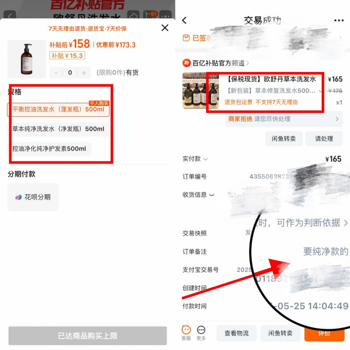 同样,在今年“6·18”活动期间,济南消费者李昂也因为售后问题感到抓狂。“我选的是纯净款,为什么发来了修复款?当时购买页面里没有这个选项。”李昂向记者展示了他的订单。5月25日,他在“百亿补贴”专区下单了一瓶欧舒丹洗发水,5月27日收货后发现“货不对板”。