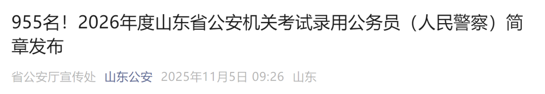 11月5日,山东公安微信公众号发布2026年度山东省公安机关考试录用公务员(人民警察)简章,详情如下: