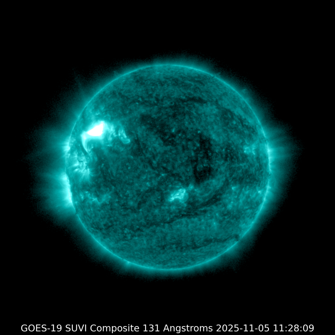 图中圆盘区域为131埃波段下的太阳,左侧偏上的白色高亮区域就是太阳耀斑