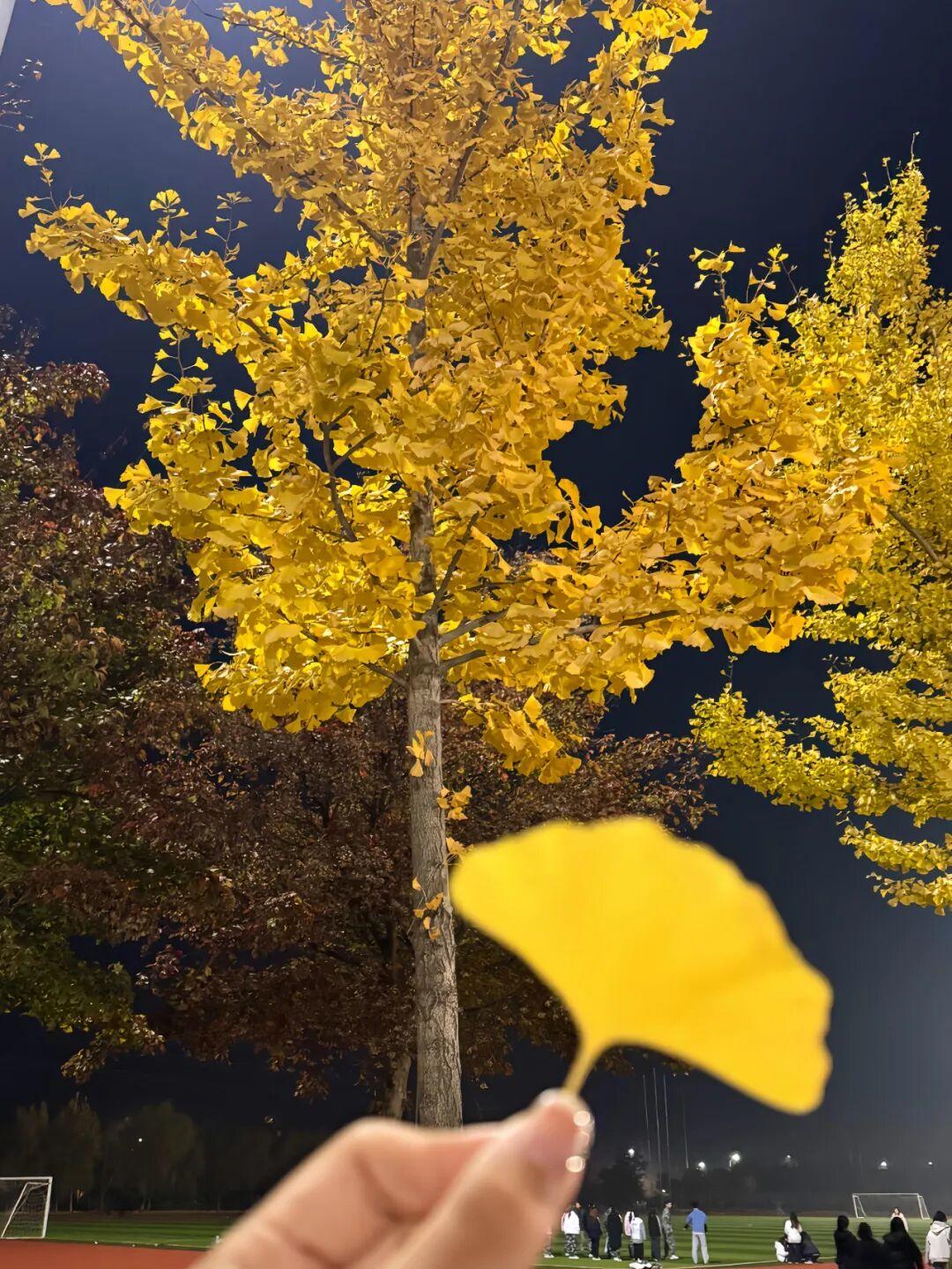 夜色里,银杏披金,微风轻拂,一片落叶道尽初冬闲韵。(作者:苏言康)