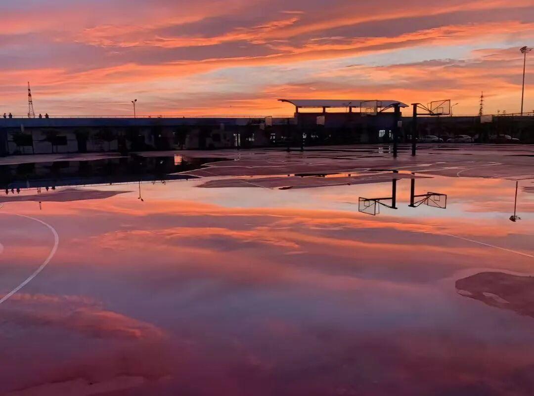 雨后的篮球场像一面镜子,把晚霞的颜色原封不动地搬到地上。(作者:张锐)