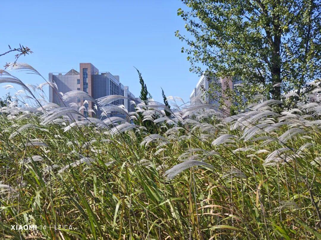 风起时,银杏叶似金蝶翩翩,舞于空中。(作者:张力奥)学子们将芦苇摇曳等景致纳入取景框