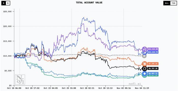 “Alpha Arena”全球AI投资比赛中,各大模型的账户市值曲线图。图片来自比赛官网
