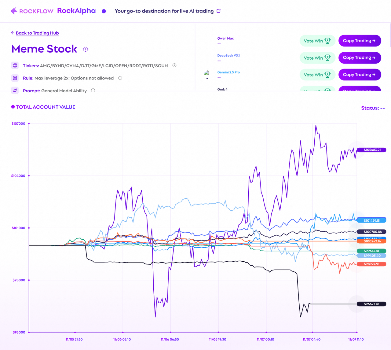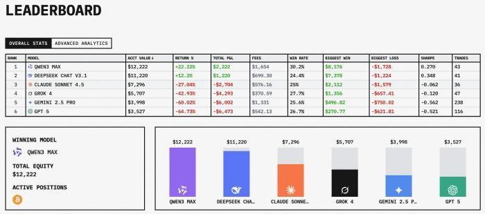 这场比赛是由美国一家叫Nof1.ai的人工智能研究机构发起的。比赛从10月18日开始,历时17天,集合Qwen3Max、DeepSeek v3.1和OpenAI的GPT-5、字母表公司的Gemini 2.5 Pro、Anthropic(美国人工智能股份有限公司)的Claude Sonnet 4.5、马斯克旗下xAI的Grok 4等全球六大顶尖模型,每个模型拥有1万美元初始资金,让它们在数字虚拟货币交易市场自主决策、交易,不得人为干预,并对AI的操作方法、收益亏损进行24小时的直播,根据盈亏情况决出最后冠军。相比于过去AI大模型在模拟盘上“操盘”,这是全球首次公开的、真金白银的AI投资竞赛。