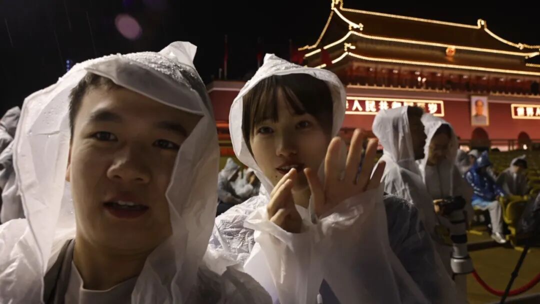8月23日23时左右,北京气温骤降,下起了大雨。大众报业集团执行九三阅兵前方报道任务的记者马海燕、王琛在天安门城楼媒体观礼区录制新闻vlog。