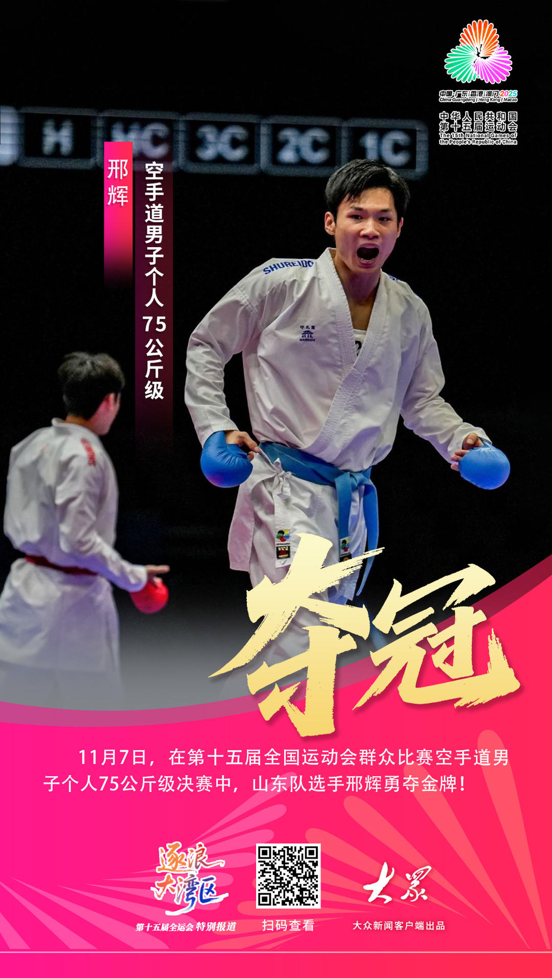 11月7日,在第十五届全国运动会群众比赛空手道男子个人75公斤级决赛中,山东队选手邢辉勇夺金牌!