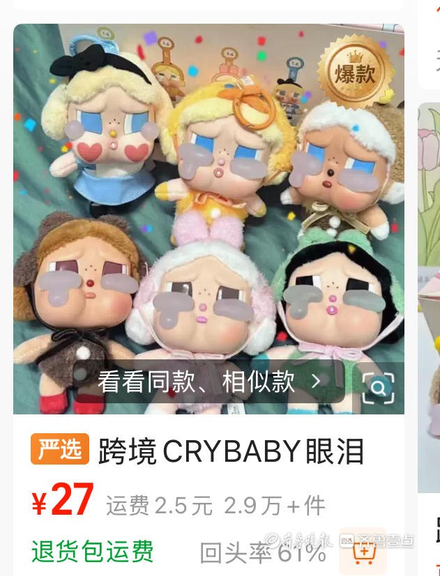 近日,泡泡玛特旗下热门IP——Crybaby推出“度假模式”系列盲盒,上线后迅速售罄,有隐藏款二级市场价格高达999元,较发售价溢价超6倍。随着潮玩市场日渐火热,不少打着“平价替代品”“高仿1:1”旗号的高仿产品也纷纷涌入市场,线上有店铺销量超十万件。