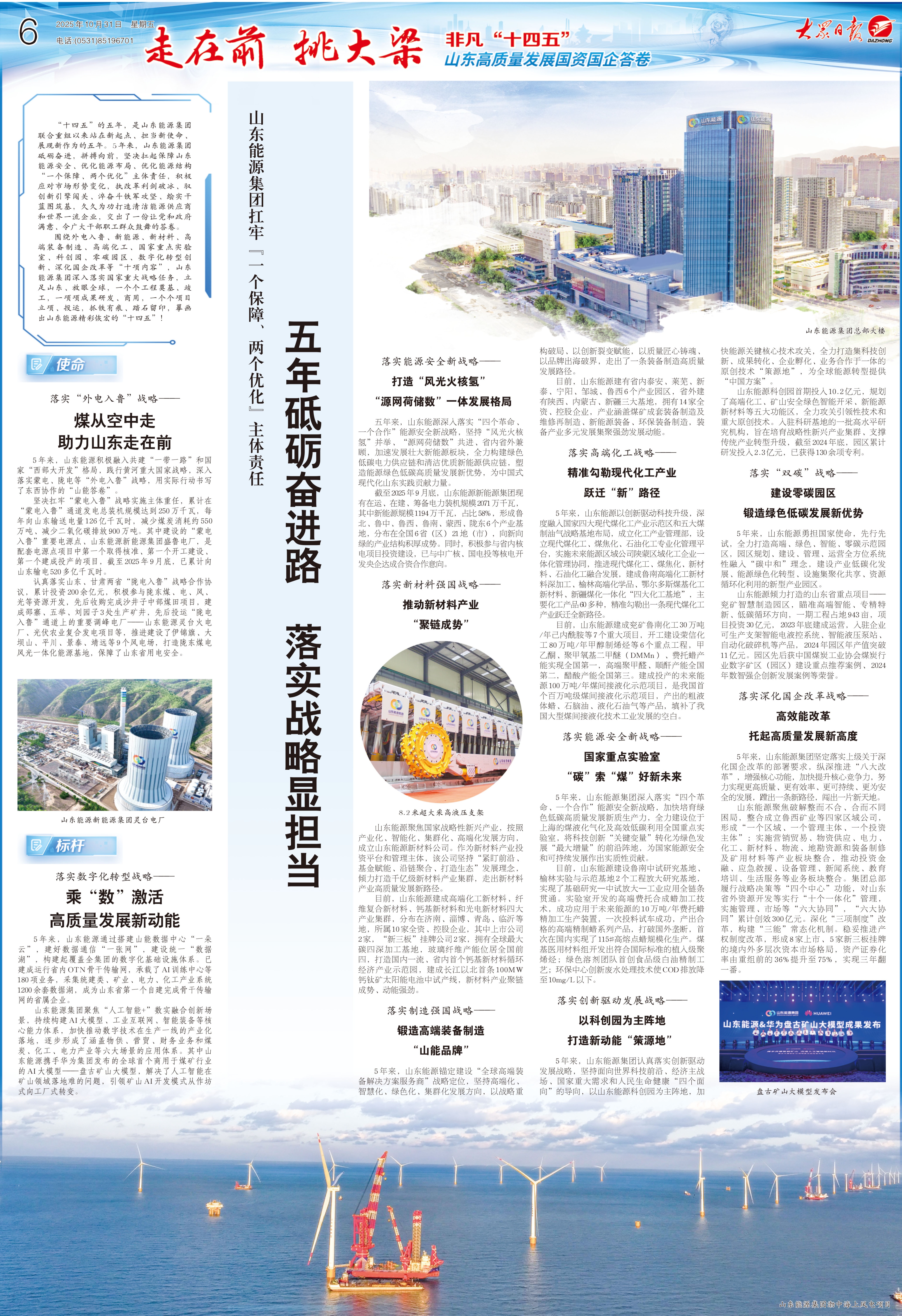 围绕外电入鲁、新能源、新材料、高端装备制造、高端化工、国家重点实验室、科创园、零碳园区、数字化转型创新、深化国企改革等“十项内容”,山东能源集团深入落实国家重大战略任务,立足山东、放眼全球,一个个工程奠基、竣工,一项项成果研发、商用,一个个项目立项、投运,抓铁有痕、踏石留印,摹画出山东能源精彩恢宏的“十四五”!