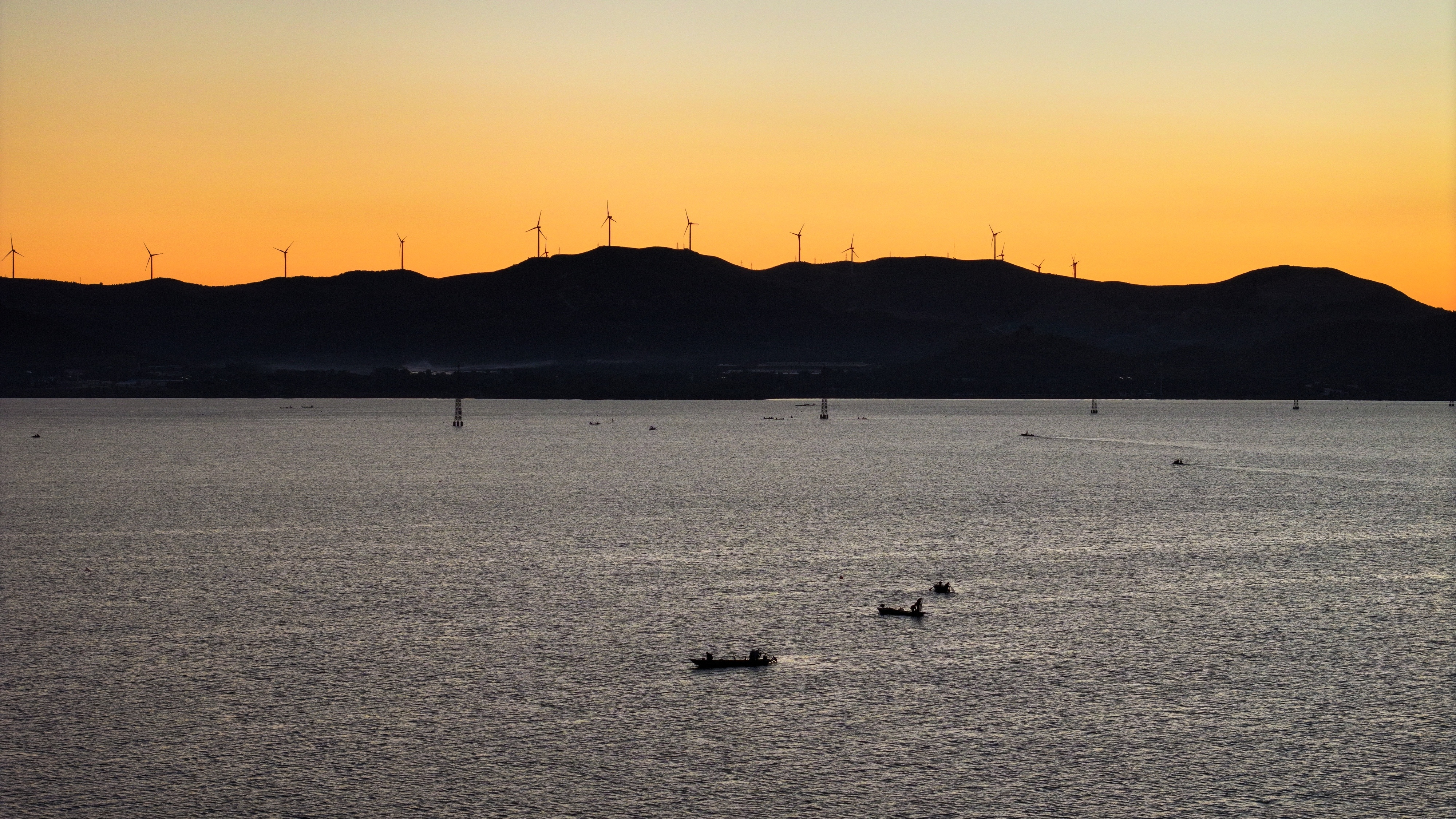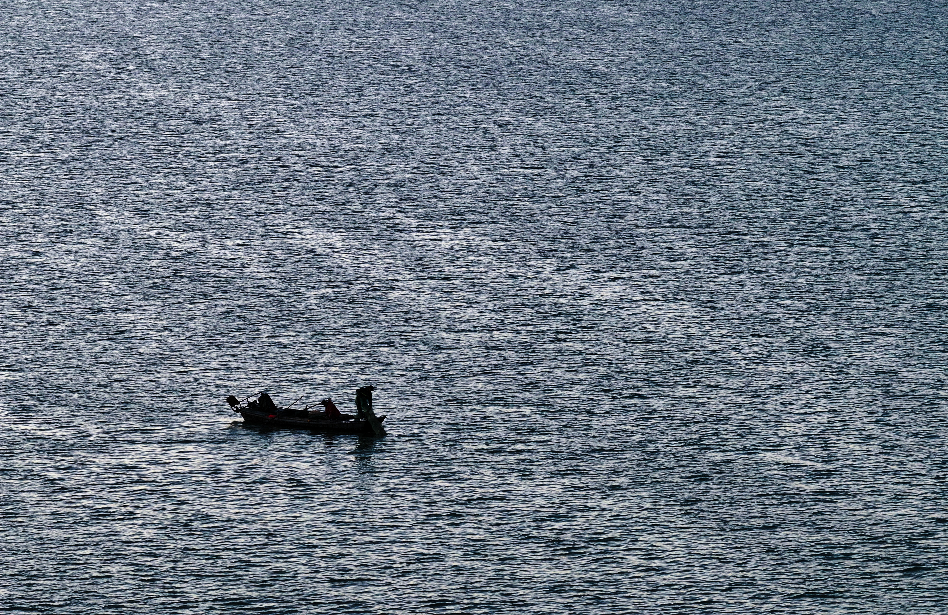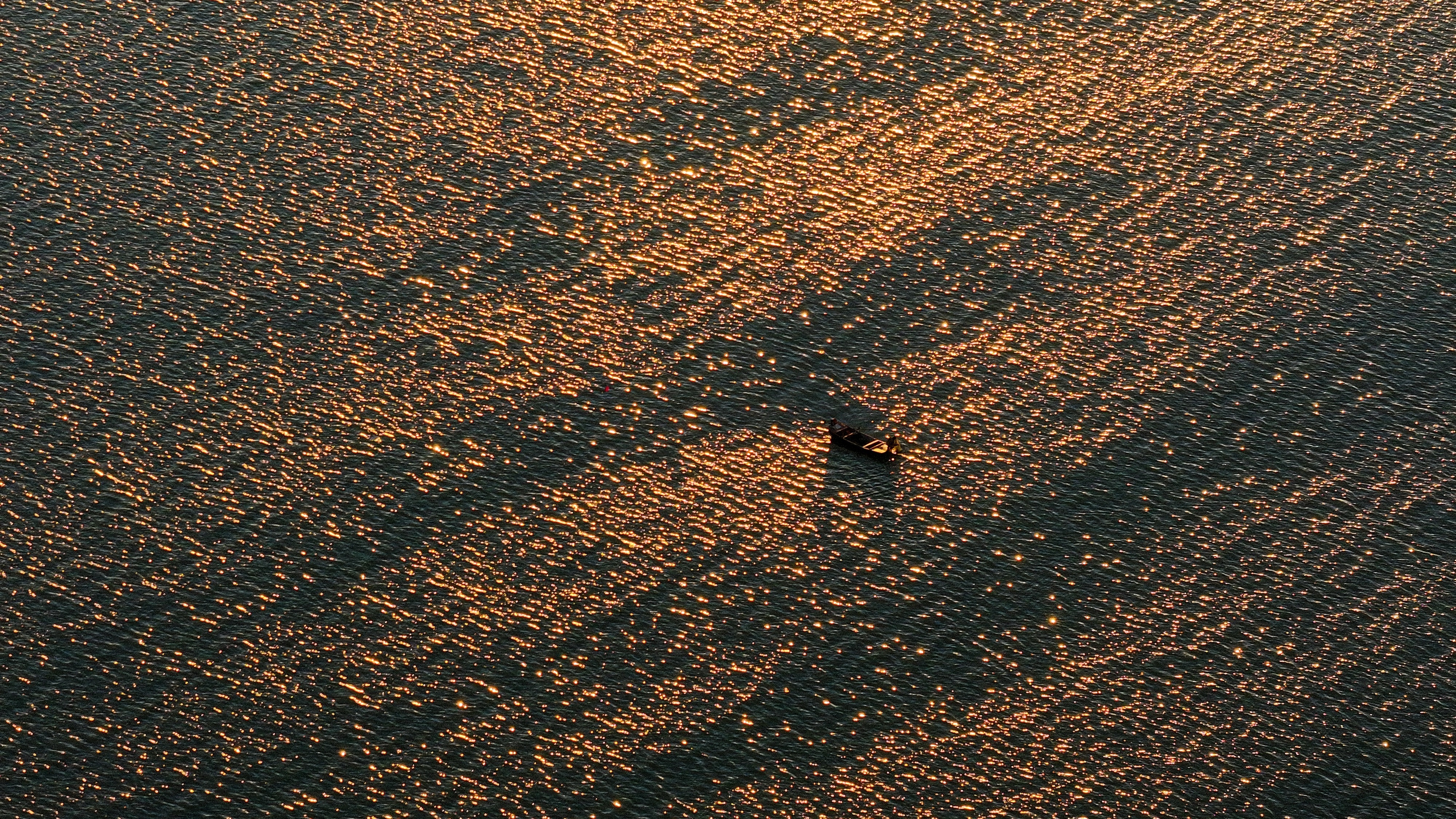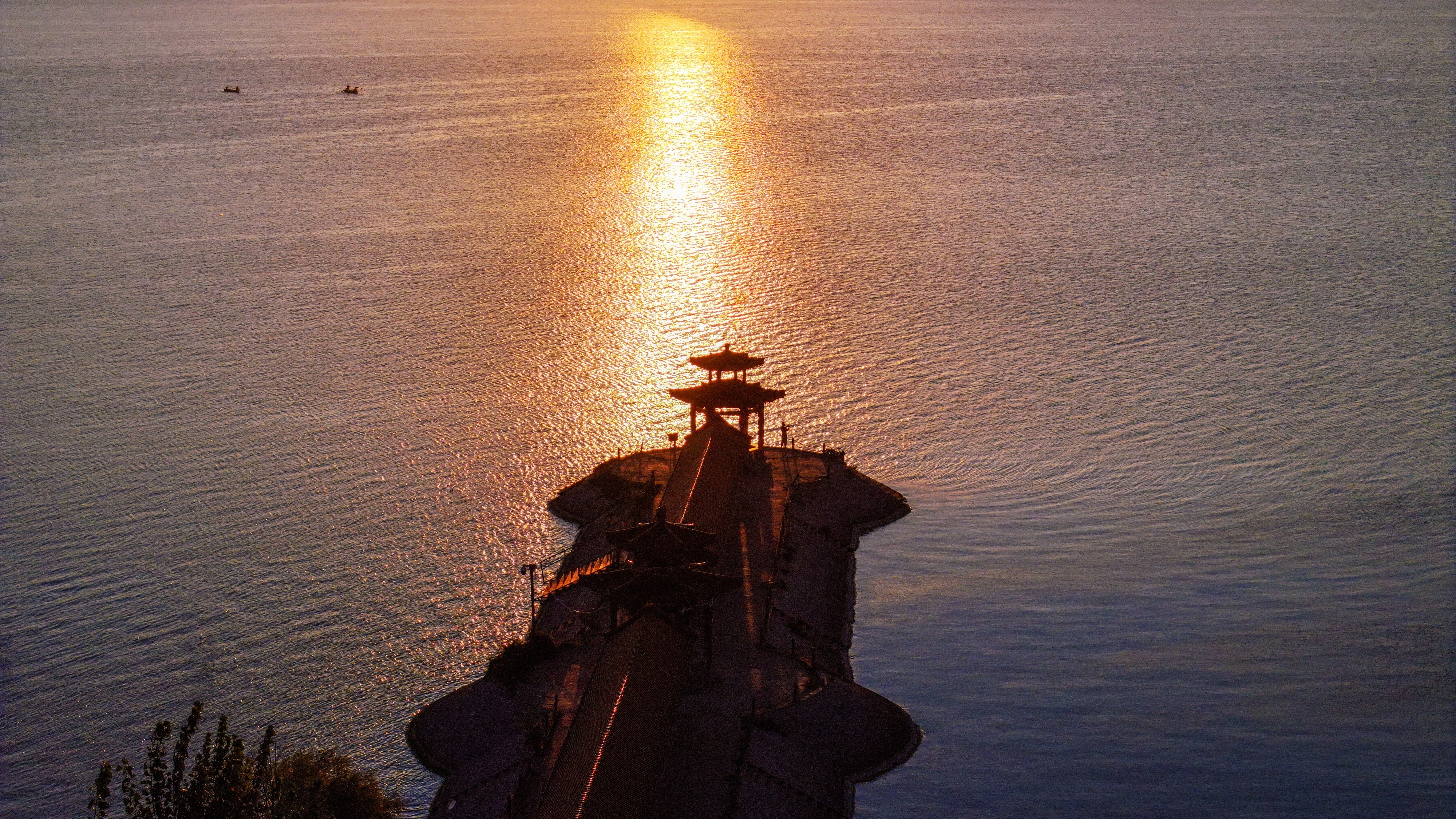 东平湖晨捕的渔船映衬在朝阳里。吴昊 摄