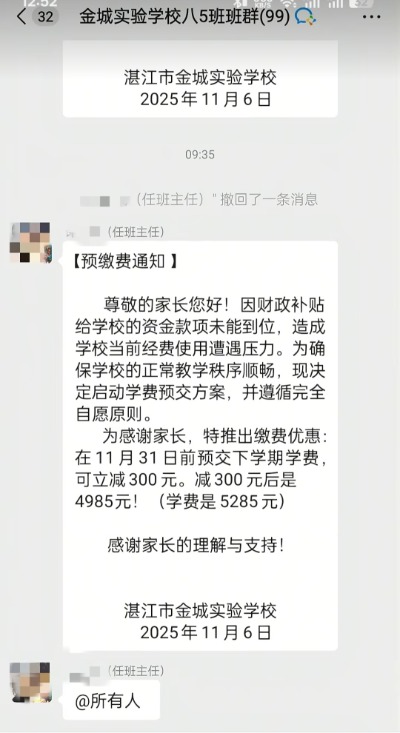 “因财政补贴给学校的资金款项未能到位,造成学校当前经费使用遭遇压力。为确保学校的正常教学秩序顺畅,现决定启动学费预交方案……”11月11日,一则落款为广东湛江市金城实验学校的通知在网上流传开来,引发热议。对此,市教育局回应称,辖区教育局已介入处理。