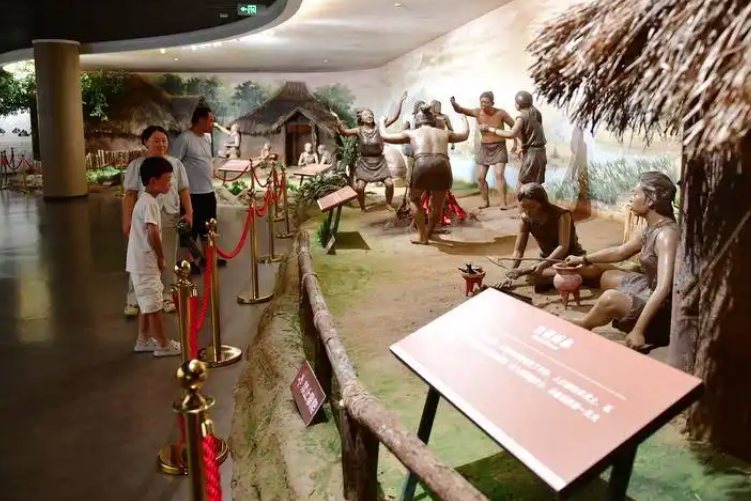 2025年7月14日,参观者在大汶口遗址博物馆内观看先民生活场景复原模型。新华社