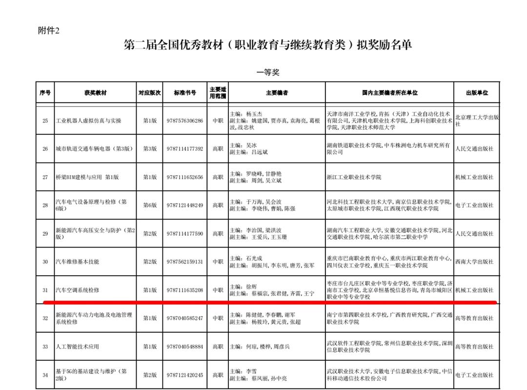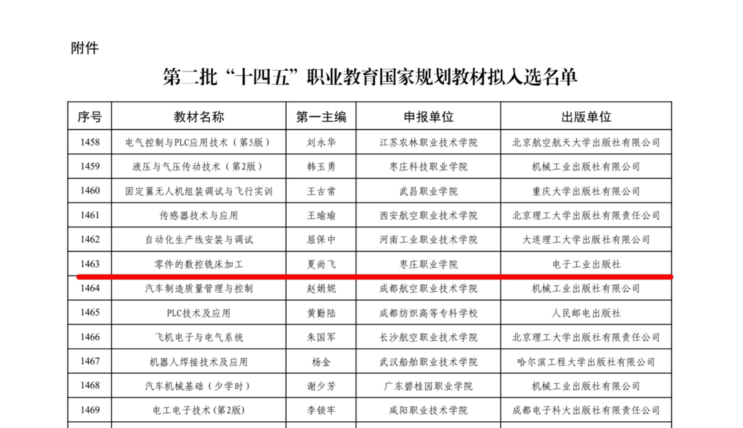 近日,教育部办公厅正式公布第二届全国教材建设奖励名单及第二批“十四五”职业教育国家规划教材书目。枣庄职业学院智能制造系教师夏尚飞与鲁南机床“大国工匠”赵峰、欣旺达电子股份有限公司高级工程师何佳春等合作编写的《零件的数控铣床加工》教材,成功入选“十四五”职业教育国家规划教材;新能源与汽车工程系教师蔡福宗作为第二完成人参与编写的《汽车空调系统检修》教材,成功入选第二届全国教材建设奖一等奖。这一成绩标志着学院在教材建设方面取得新突破,是深化产教融合、推进校企双元育人的重要标志性成果。