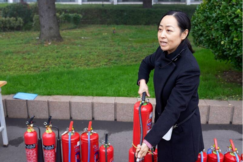 在办公楼西侧的实操教学区,更是热闹非凡。安保项目部工作人员拿起一具干粉灭火器,一边演示一边讲解:“第一步提,要平稳提起灭火器;第二步拔,拔掉保险销;第三步握,一手握住喷管根部,一手握住压把;第四步压,对准火焰根部按压喷射。”说完,他还邀请职工上台实操,从握姿到喷射角度,逐一纠正不规范动作。“以前光听理论没实操过,今天亲手试了才知道,原来对准火焰根部这么关键!”刚完成实操的一位职工表示。