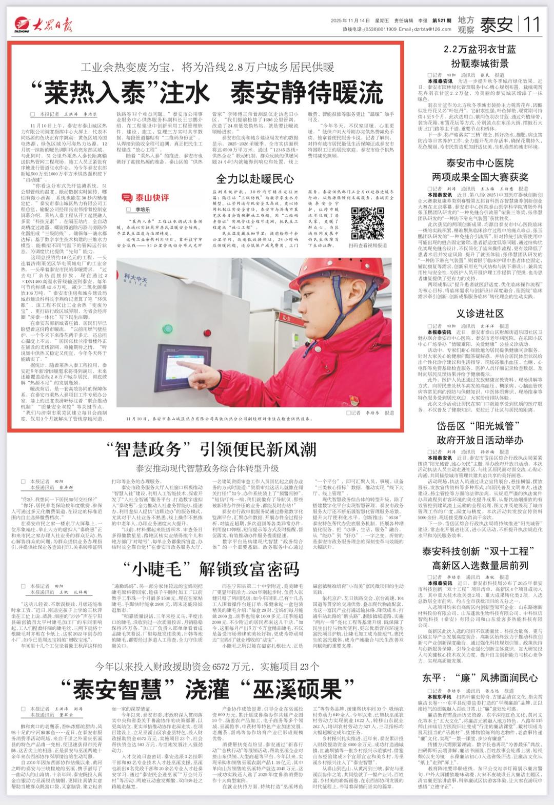 11月14日,大众日报《泰安新闻》推出重磅策划“聚焦冬季供暖”,报道莱热入泰开始注水,12月初,泰城居民将用上莱芜热源。详情请点击这里—